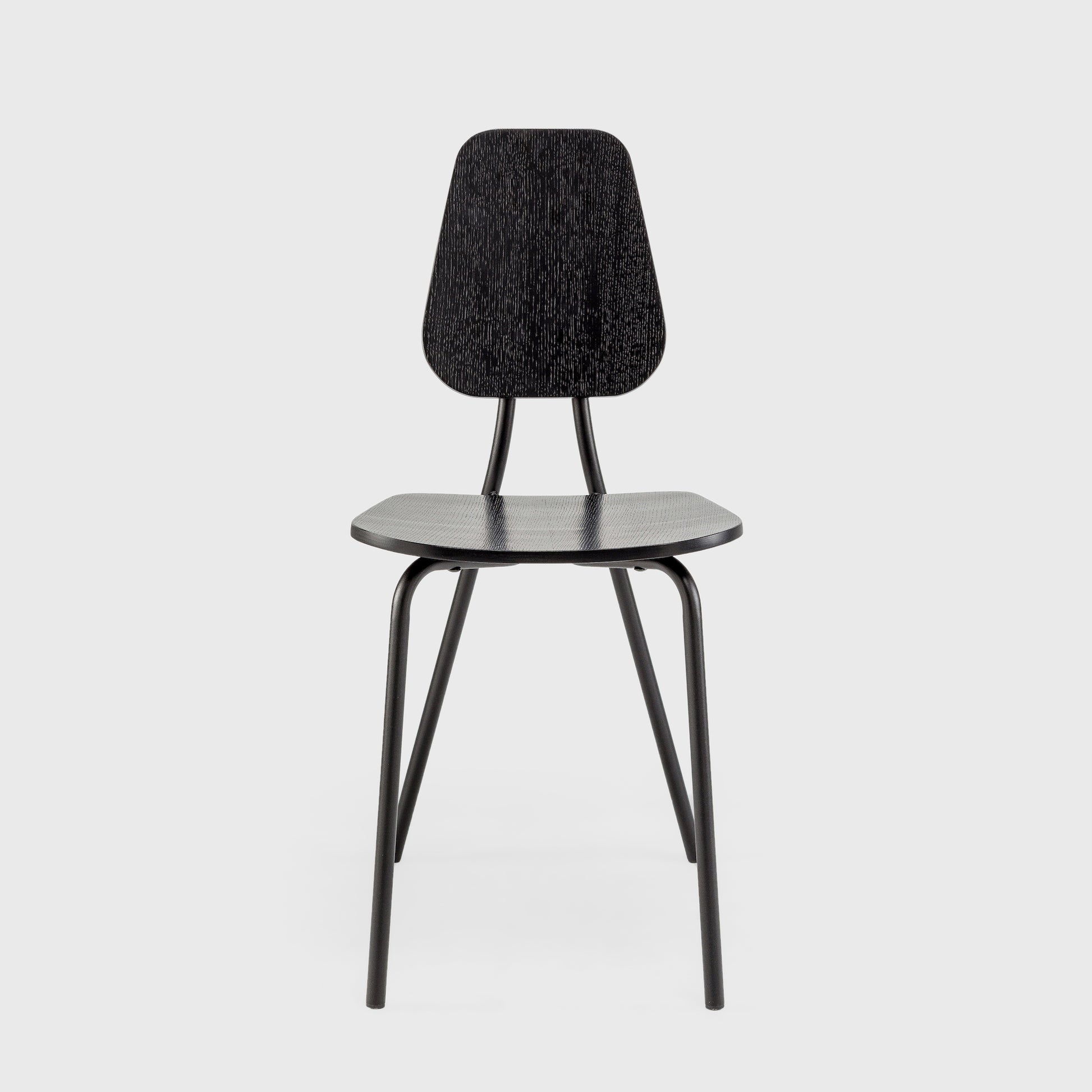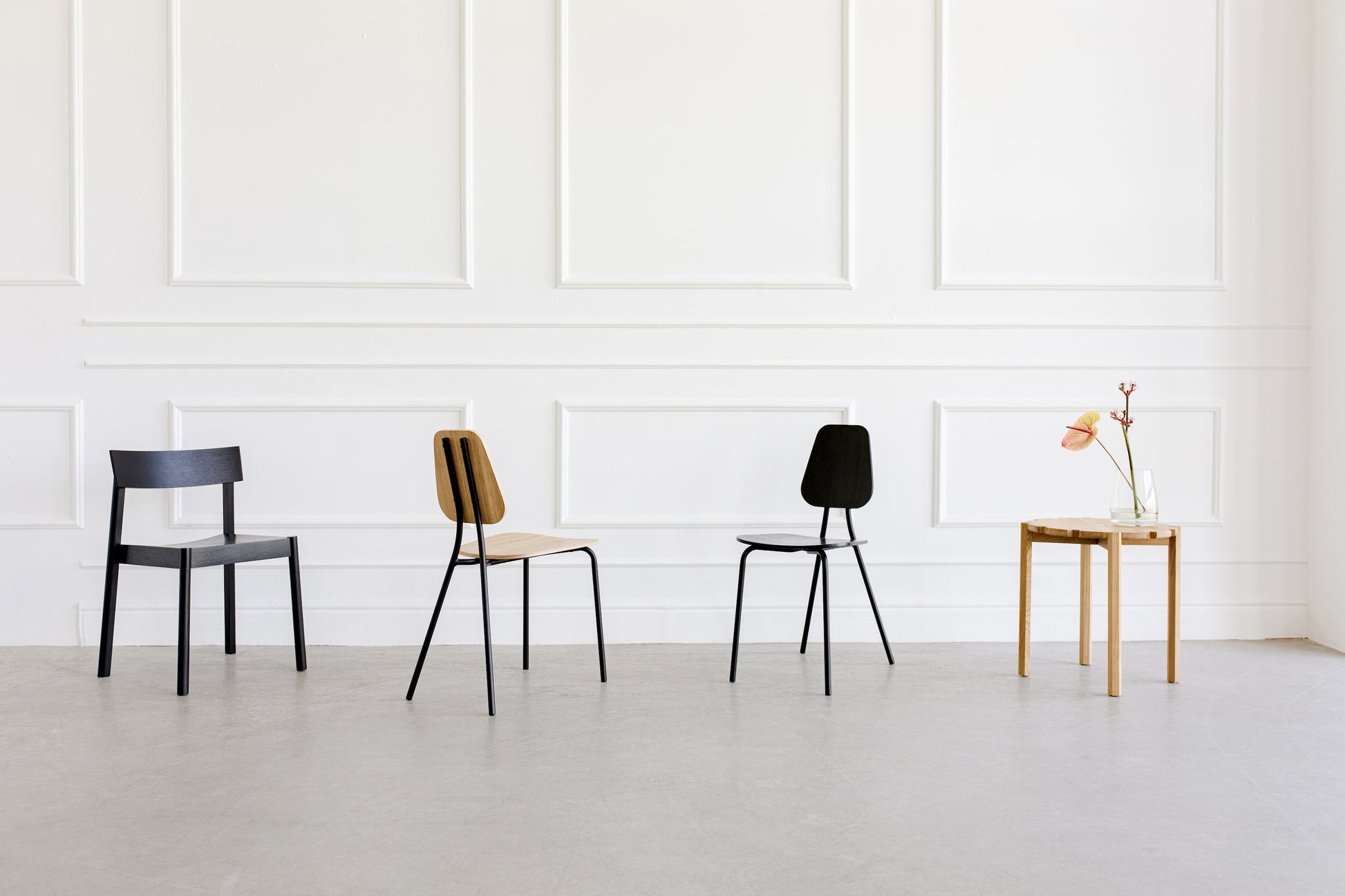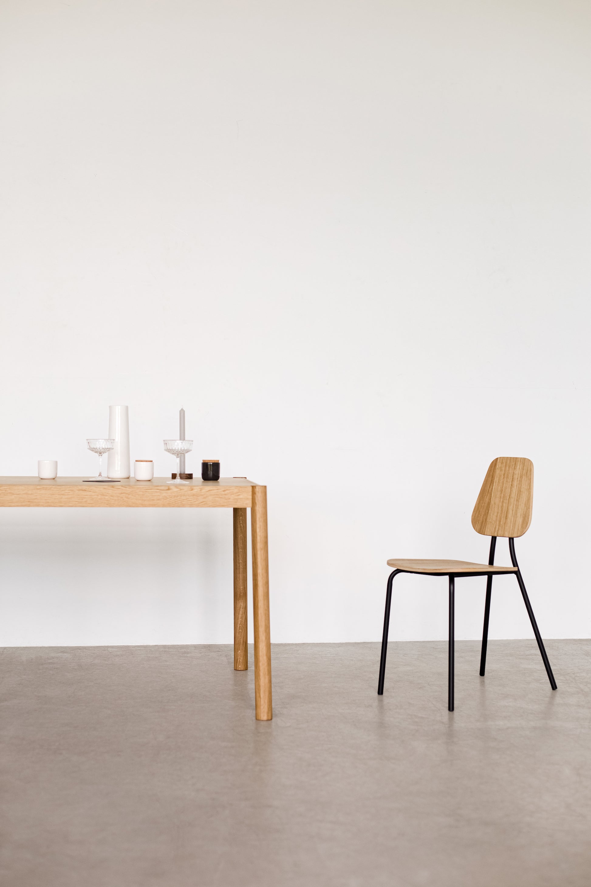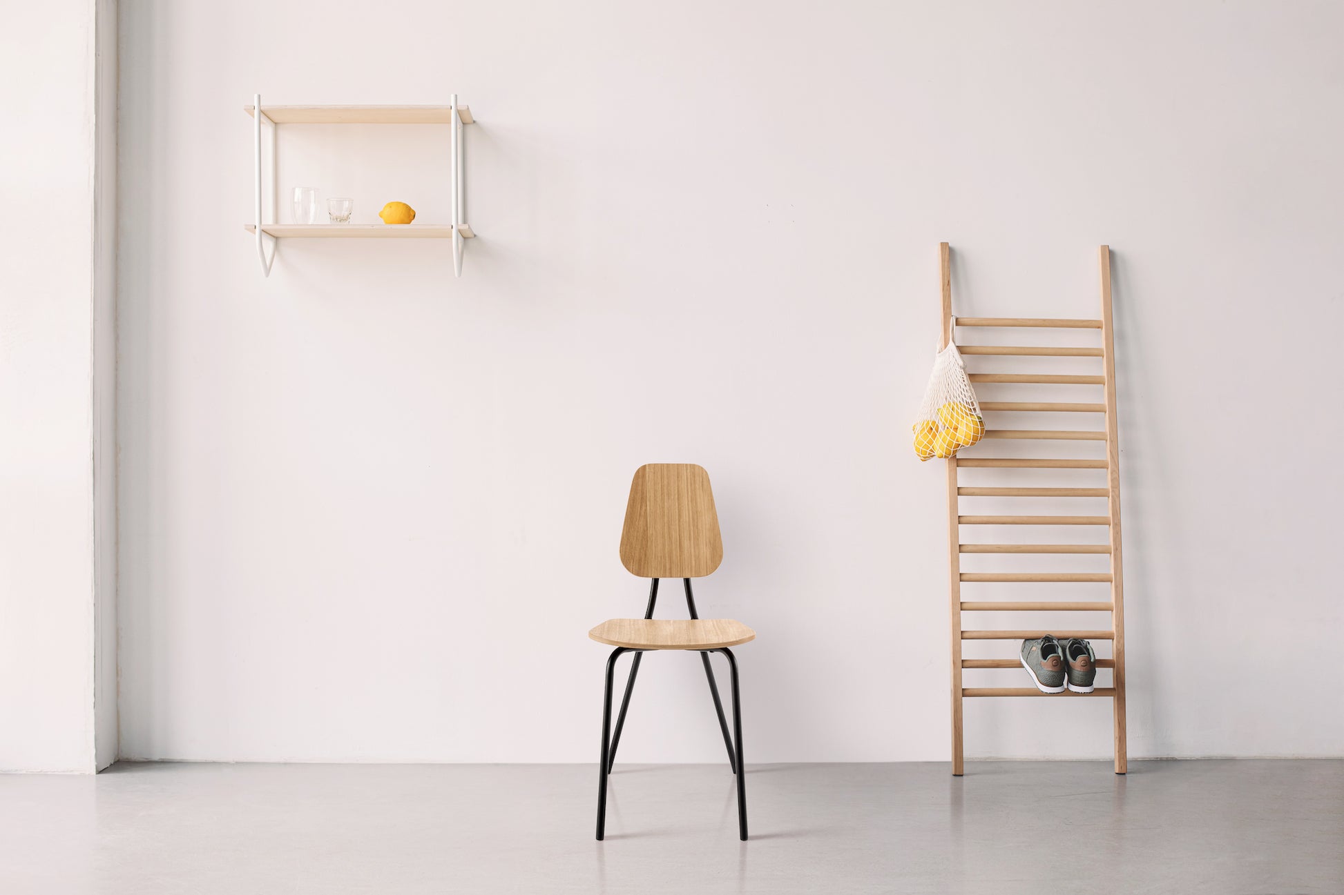 Hoya chair consists of a black metal frame and veneered plywood backrest and seat, available in two finishes — natural oil and black. Compact Hoya chairs are also stackable and come in a flat pack, this way being sustainable in terms of transportation and packaging.
