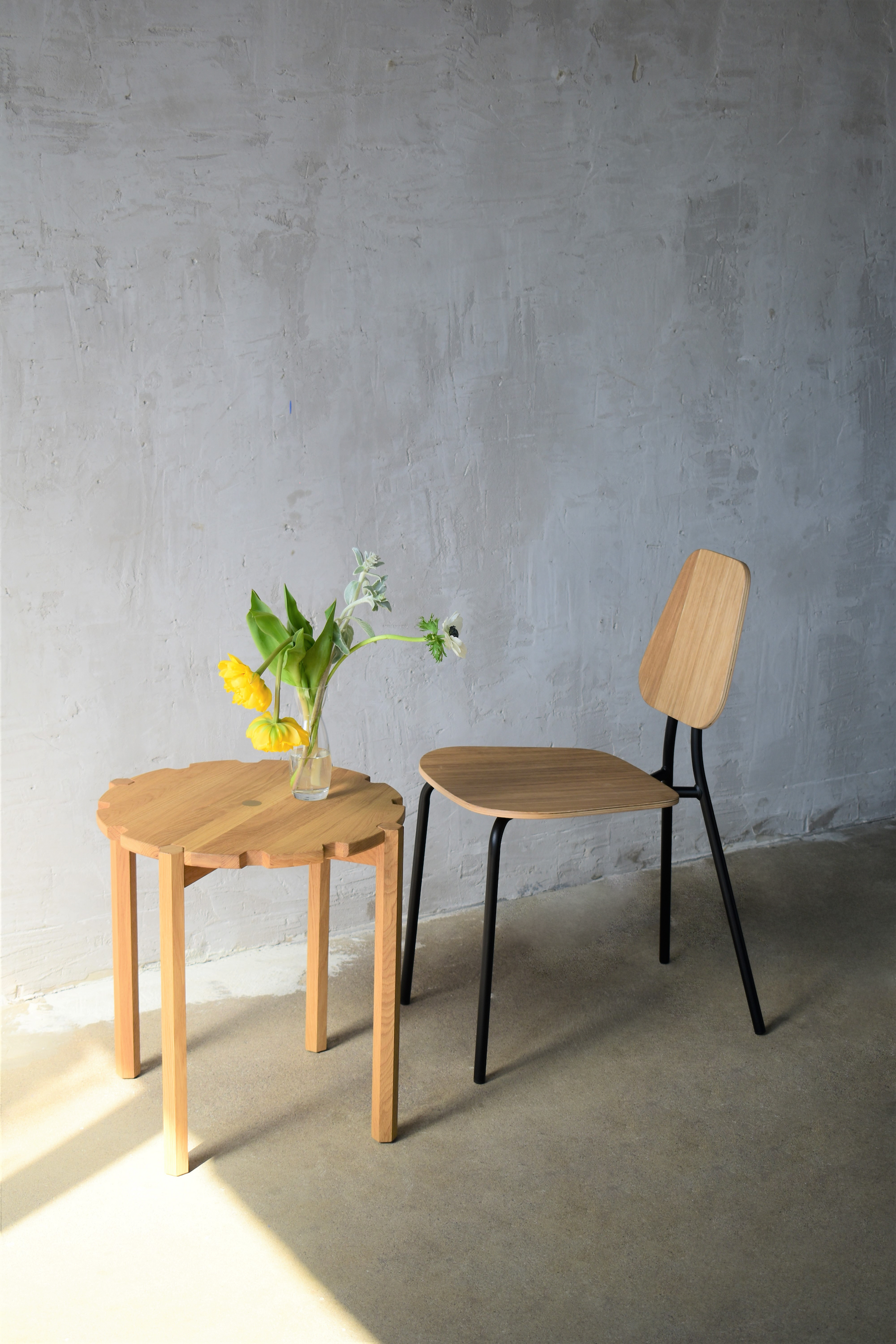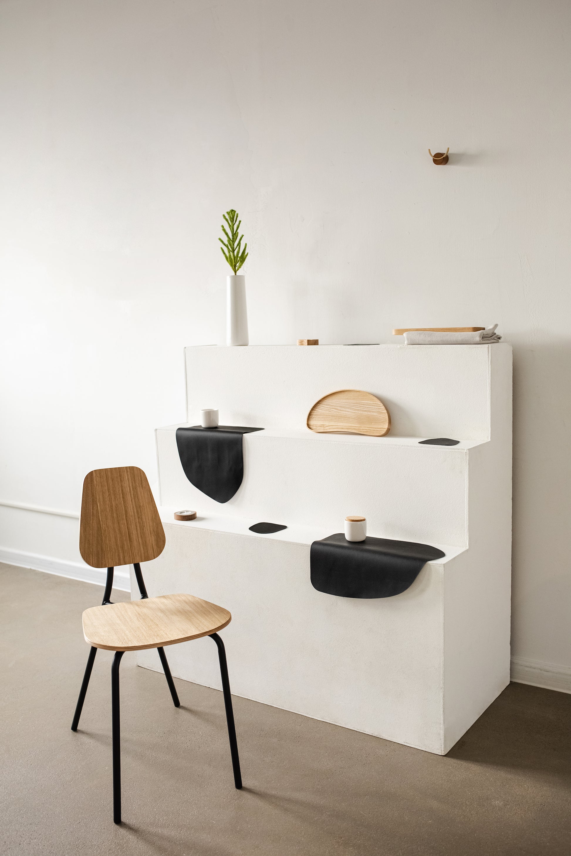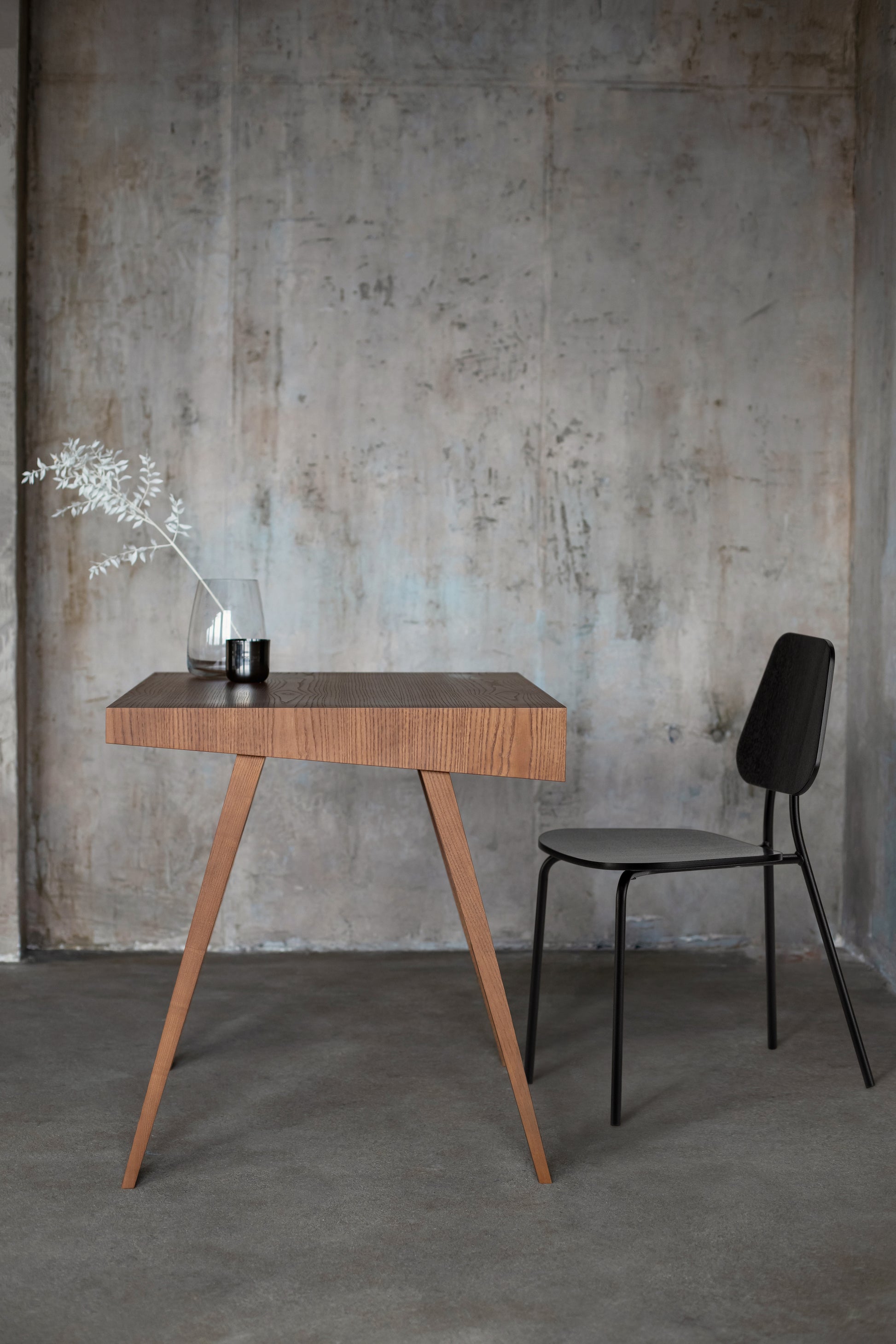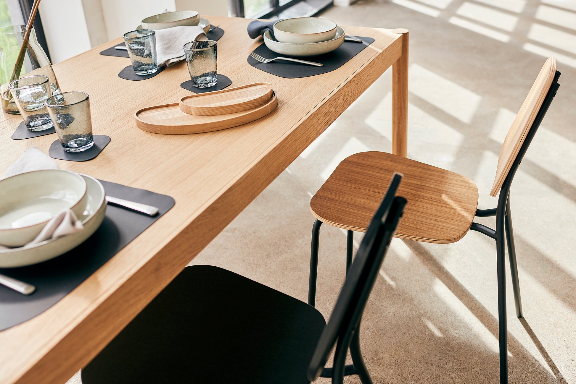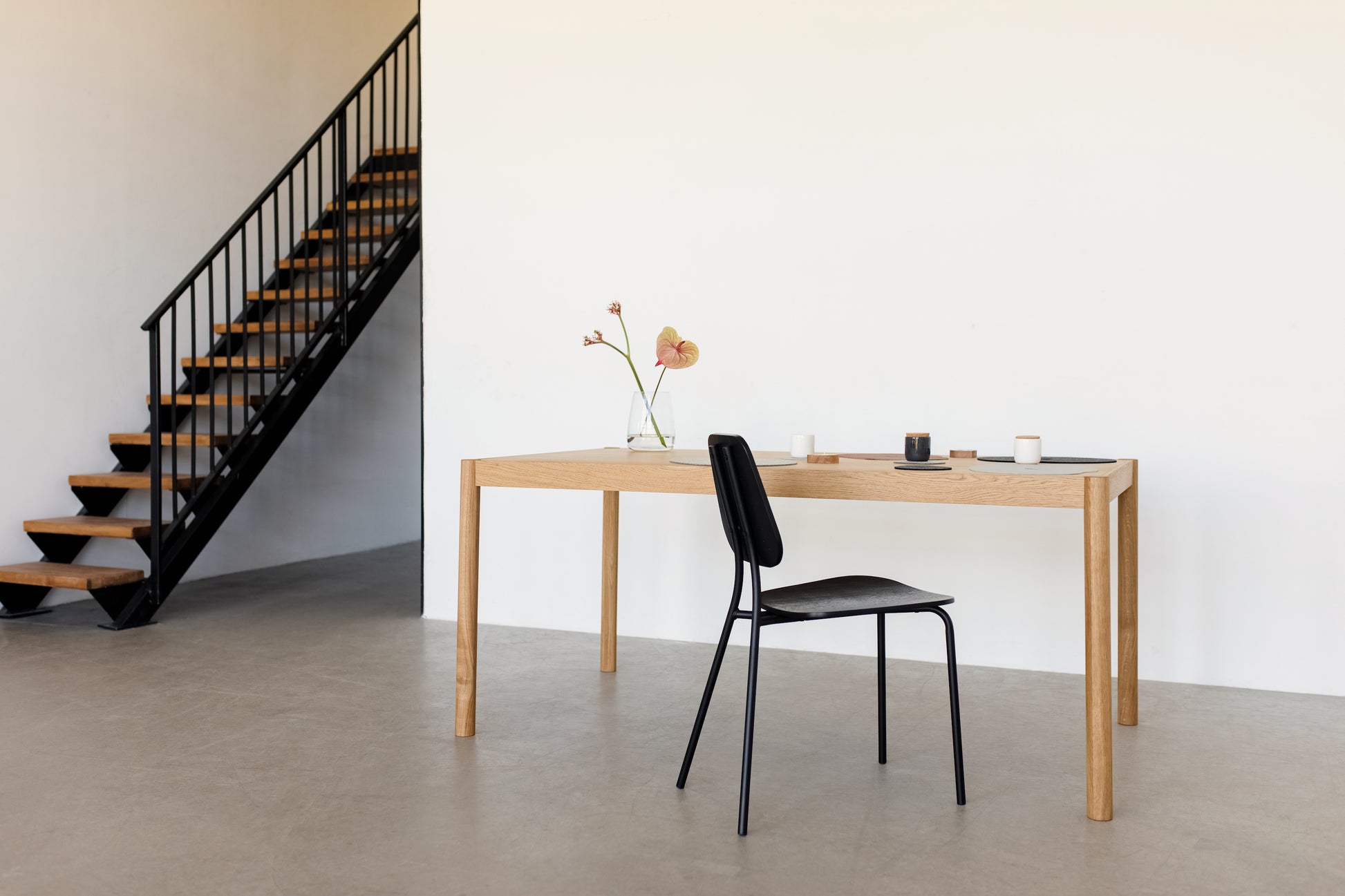 Hoya chair consists of a black metal frame and veneered plywood backrest and seat, available in two finishes — natural oil and black. Compact Hoya chairs are also stackable and come in a flat pack, this way being sustainable in terms of transportation and packaging.