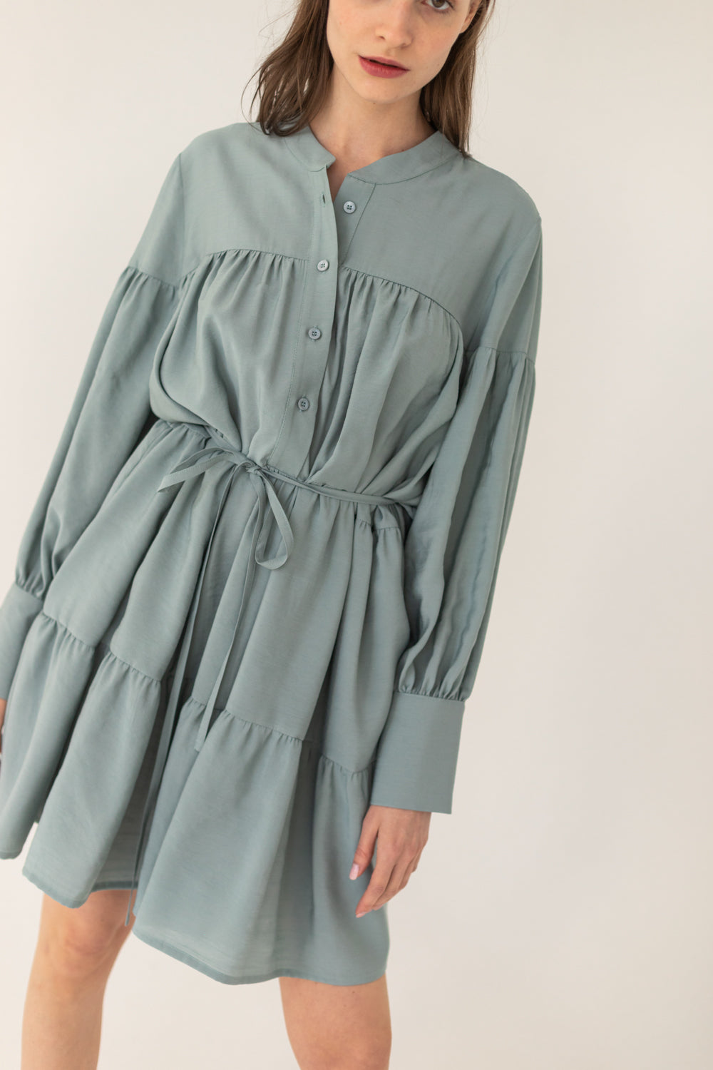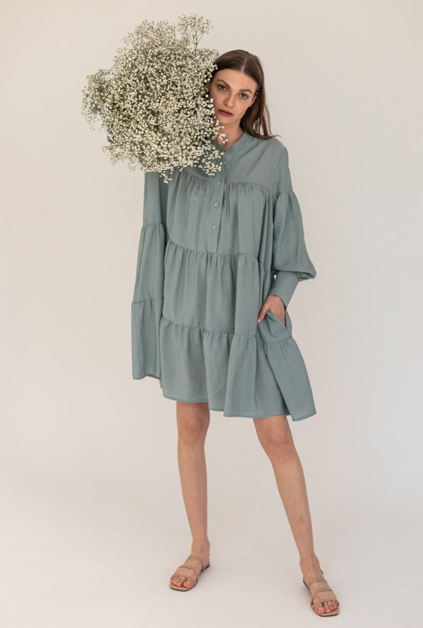 SOMEFANCYNAME.COM brings you this locally-produced Idylle Ecru Dress - Pale Sea. It features a loose-fit, short A-line shape with slightly crinkled frills. The dress has a shirt top with a stand-up collar, fastened with buttons, and slightly puffed sleeves with a longer cuff with three buttons.
