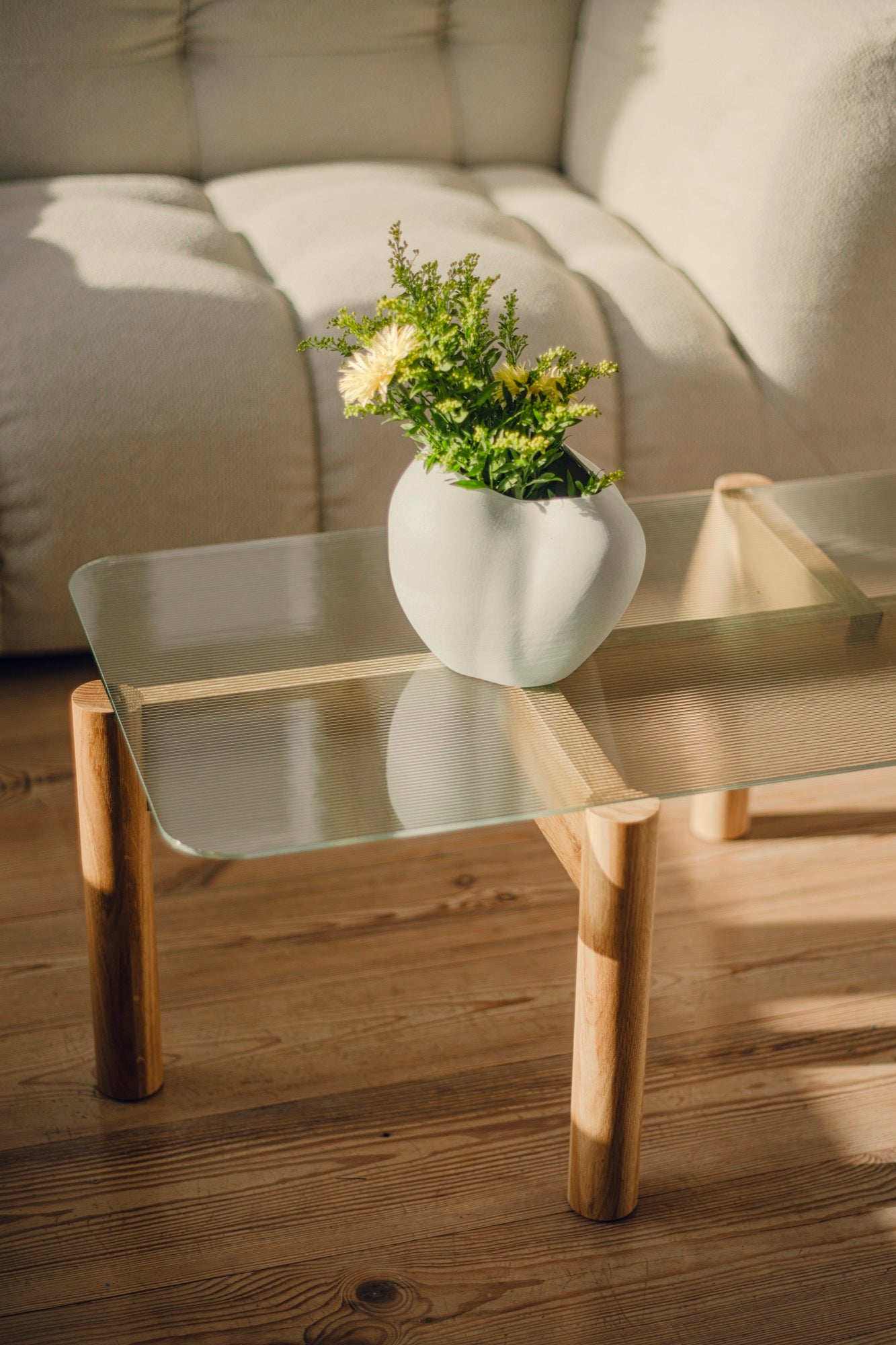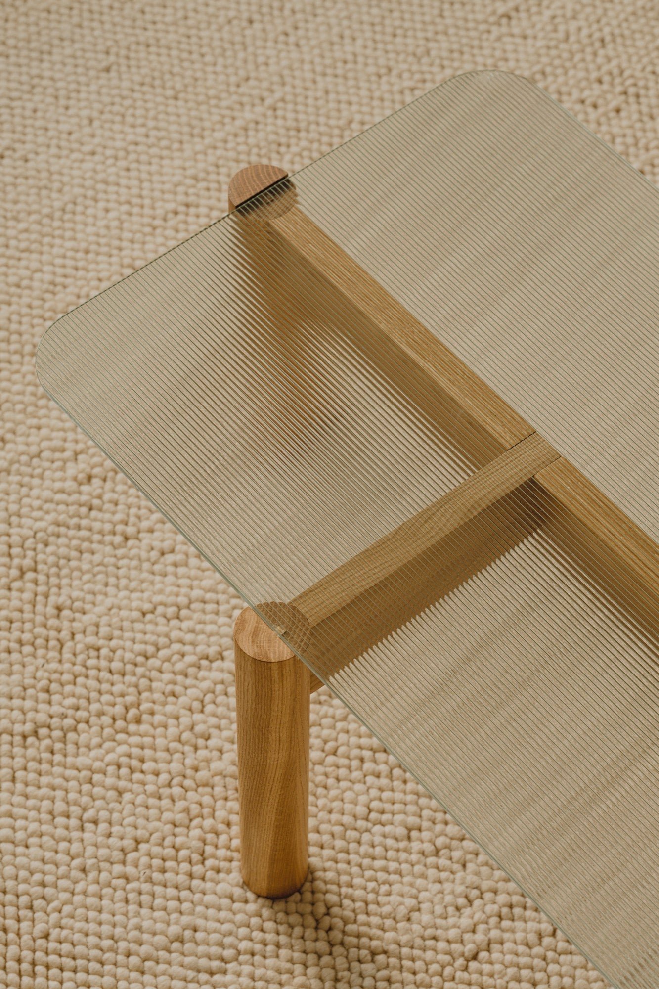 SOMEFANCYNAME.COM brings you this one-of-a-kind Kob Beechwood Coffee Table handcrafted by local artisans. Its textured glass tabletop and solid wood legs positioned differently, in vulcano black, forest green, or wine-berry colors, create a stunning minimalist design with an eye-catching blend of materials.
