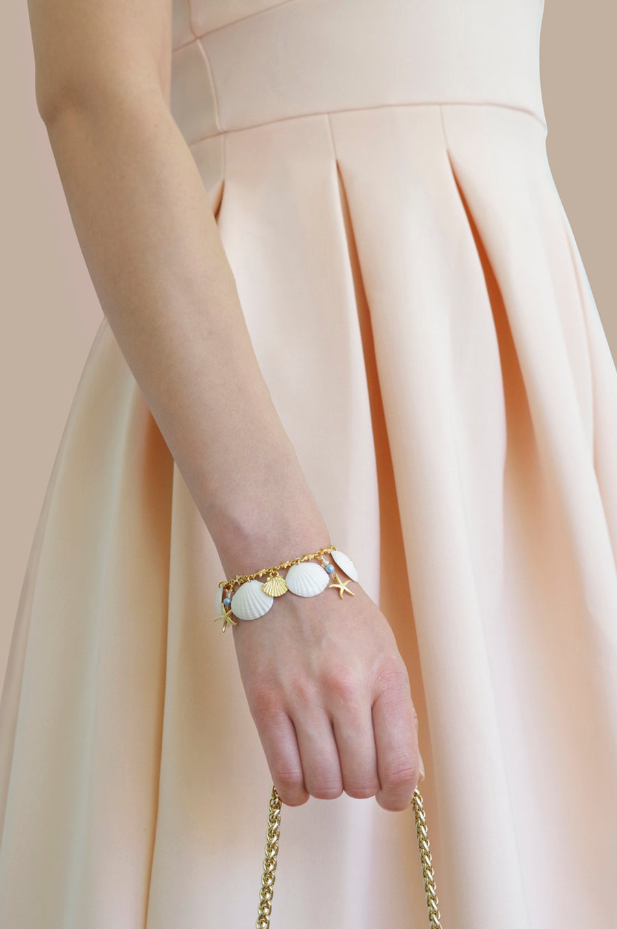 Crafted with care and precision, each necklace features delicate white porcelain shells, a golden starfish charm, and clam shells, creating a truly unique and stunning design. The bracelet is completed with shimmering Swarovski beads and a gold-plated brass chain, adding a touch of elegance to the playful design.