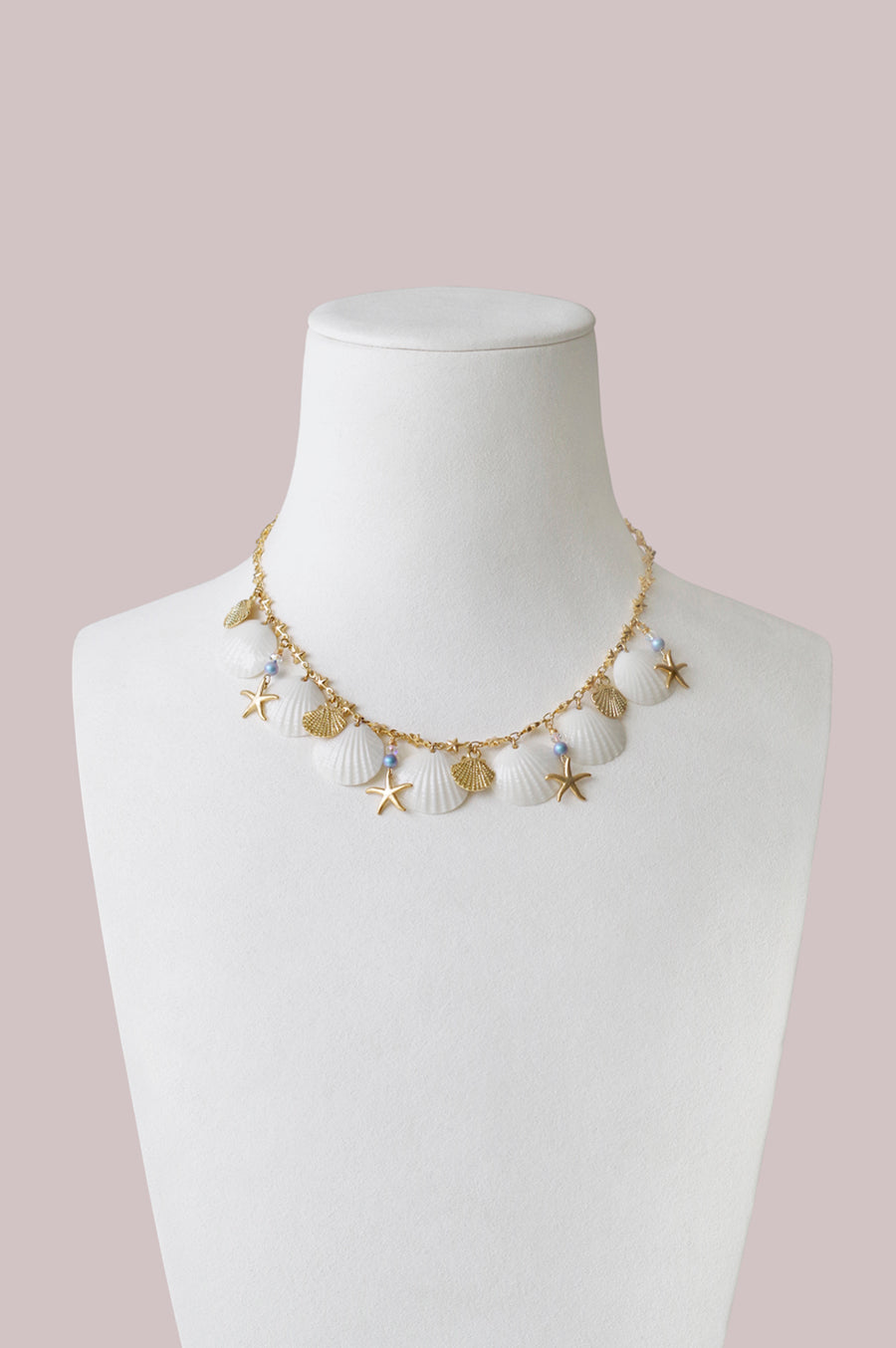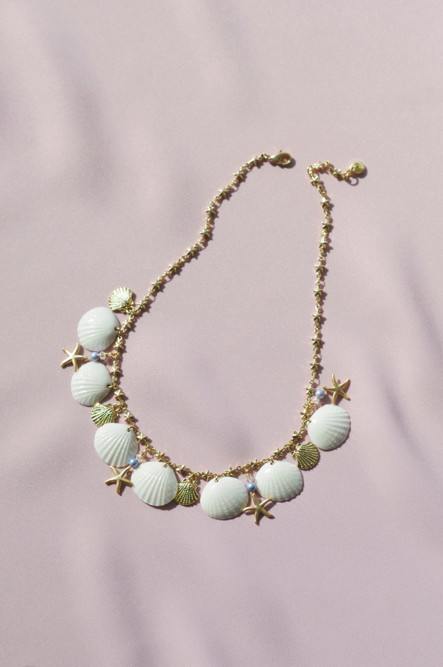 Crafted with care and precision, each necklace features delicate white porcelain shells, a golden starfish charm, and clam shells, creating a truly unique and stunning design. The necklace is completed with shimmering Swarovski beads and a gold-plated brass chain, adding a touch of elegance to the playful design.