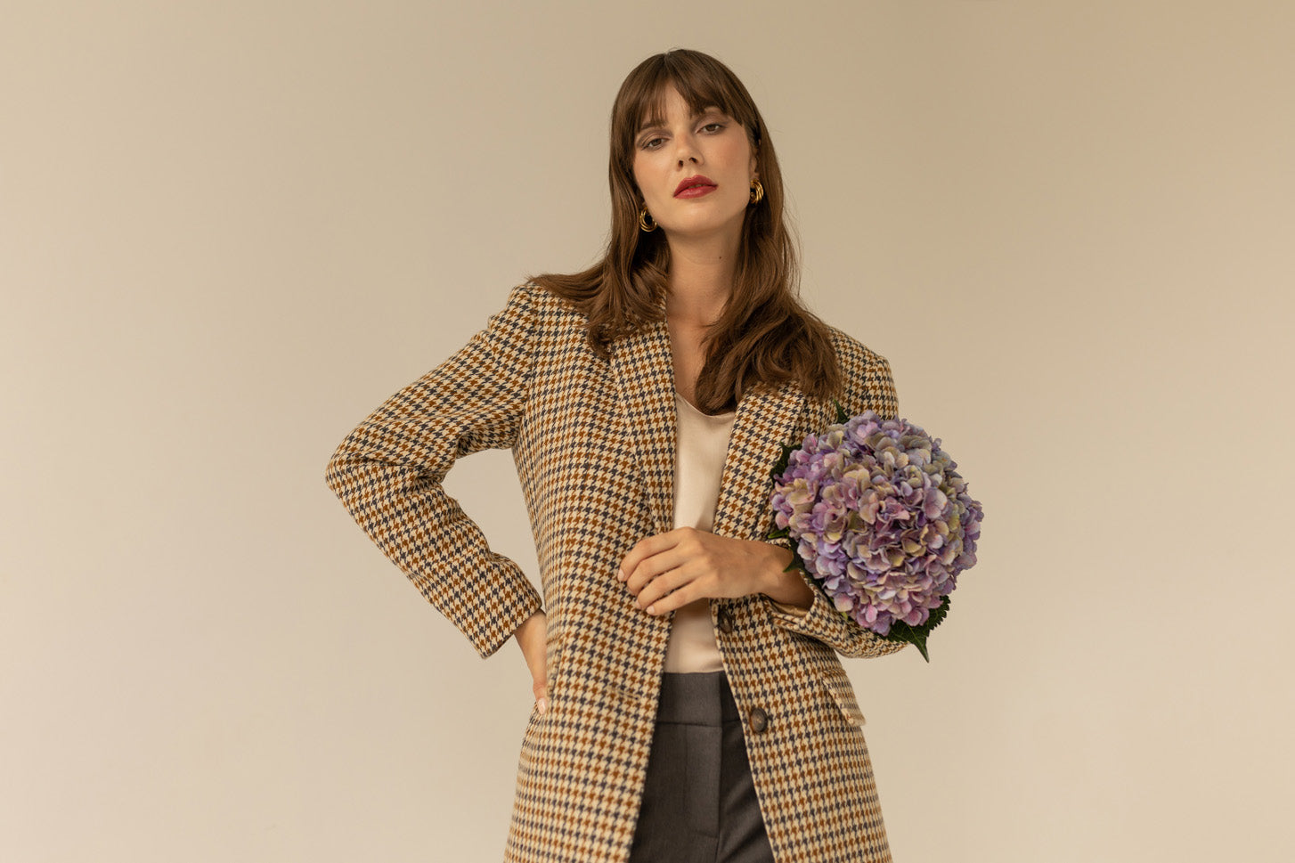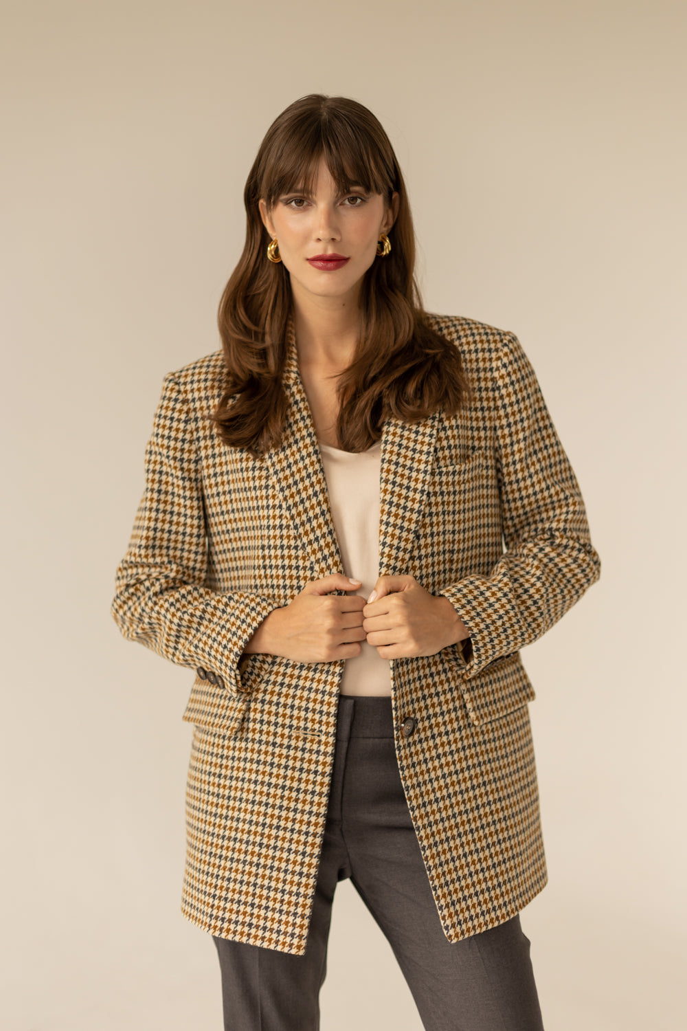 SOMEFANCYNAME.COM presents this locally crafted Maddison Blazer in a timeless houndstooth print. This blazer has a modern yet slightly oversized cut with dropped shoulder seams and two-button fastening. The long and slightly loose fit ensures comfort while still looking tailored. It's crafted with thicker, fleshy viscose fabric featuring off-white, brown, and navy blue colors with a detailed lining and chocolate brand logo buttons.