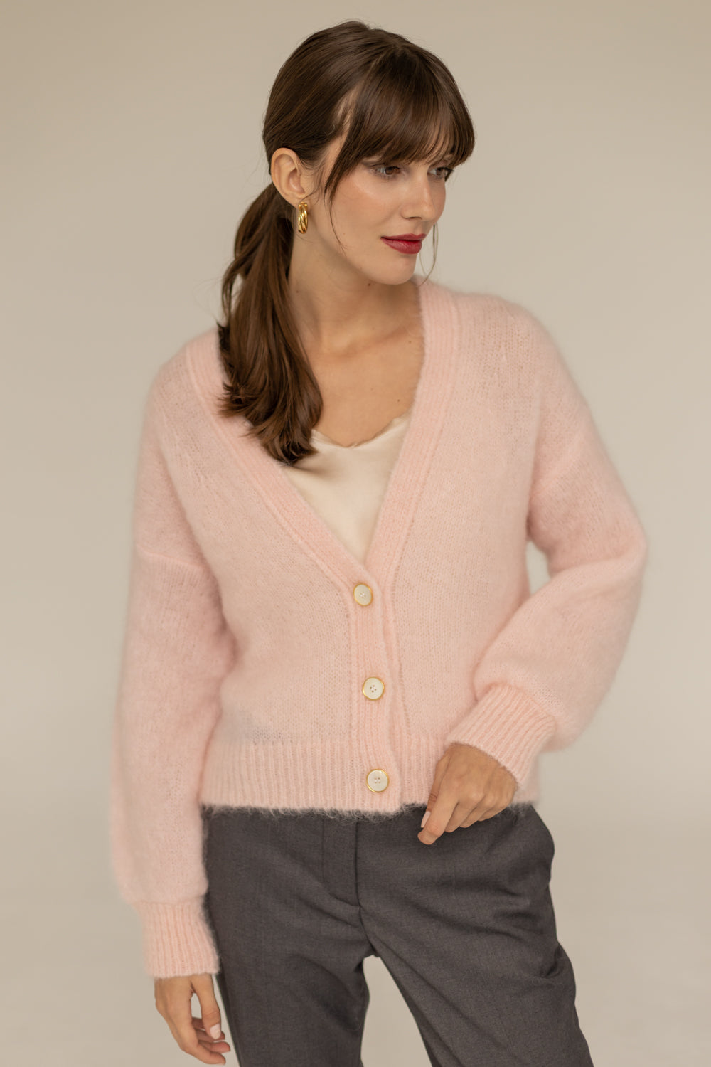 SOMEFANCYNAME.COM brings you a Mia Mohair Wool Cardigan - Pink. Cut in a loose box shape, this short cardigan is locally made from an ultra-soft mohair yarn with a lengthy pile. With subtly dropped shoulders, ribbed cuffs and hem, and puffed sleeve cuffs, it takes design cues from classic silhouettes. This timeless piece fastens with three mother-of-pearl buttons with a gold rim.