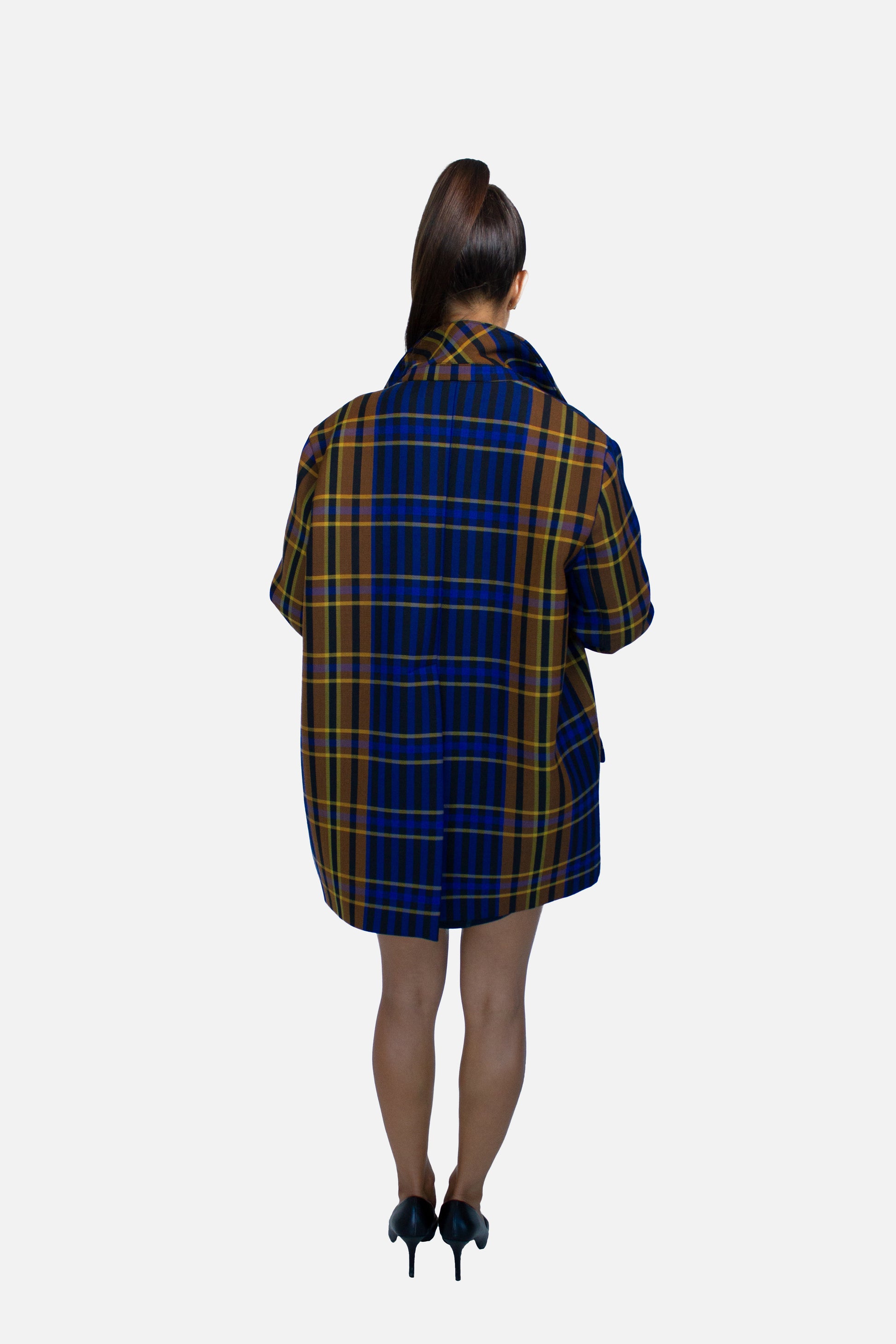 Double breasted technical wool jacket from TELA featuring wide lapel, straight fit, two flap pockets at front and four button closure at front. It comes in beautiful cornflower blue, mustard yellow and brown checks.
