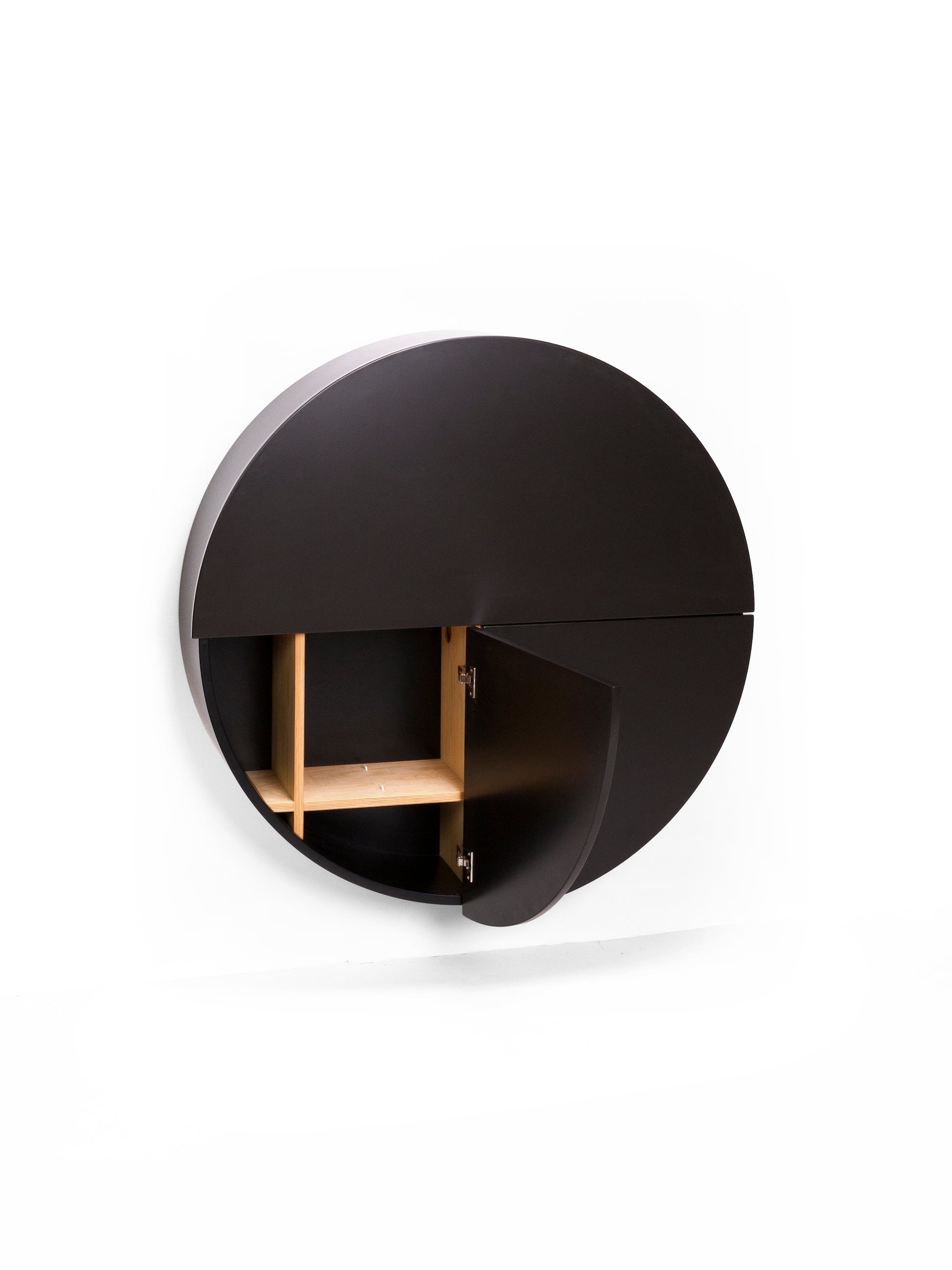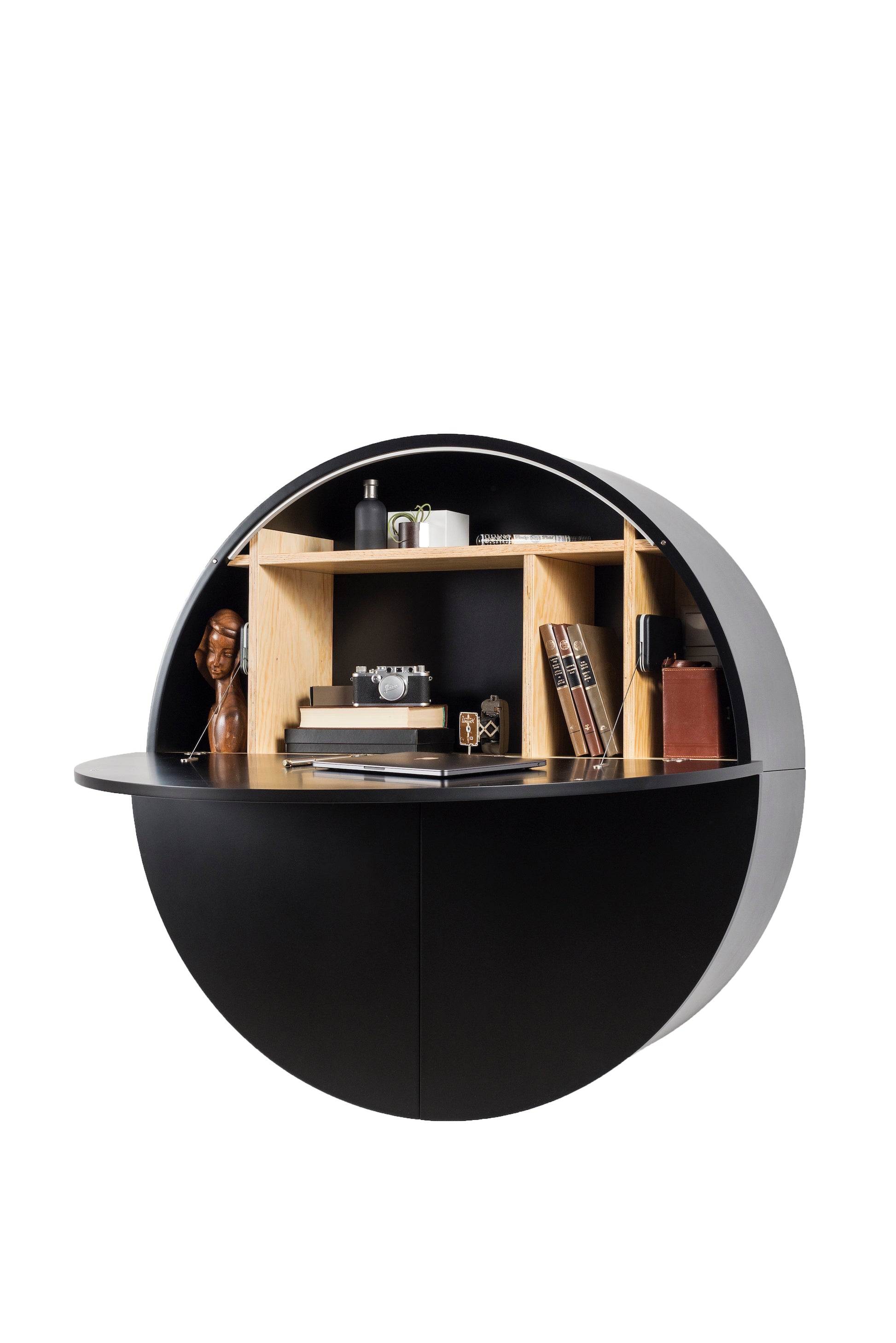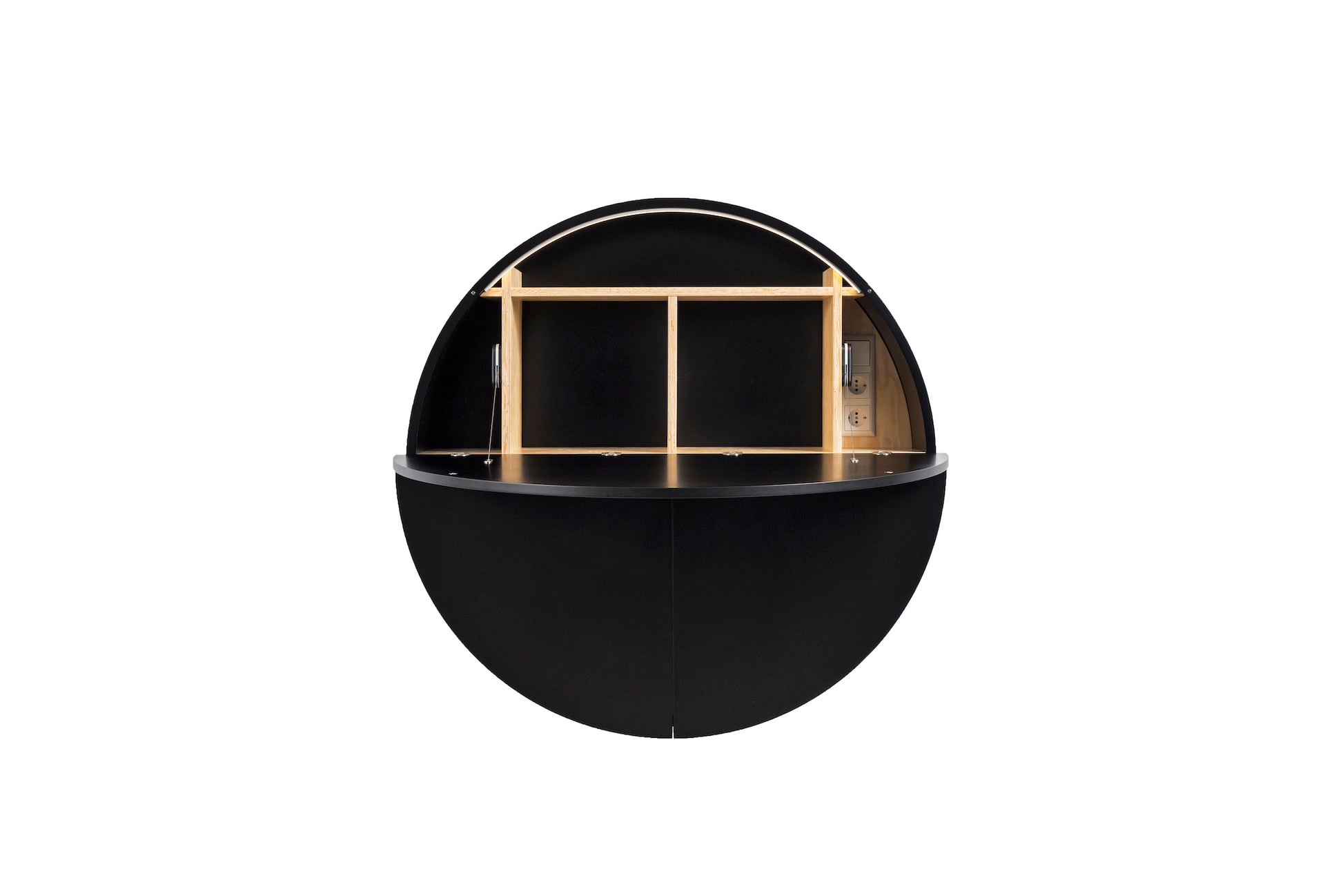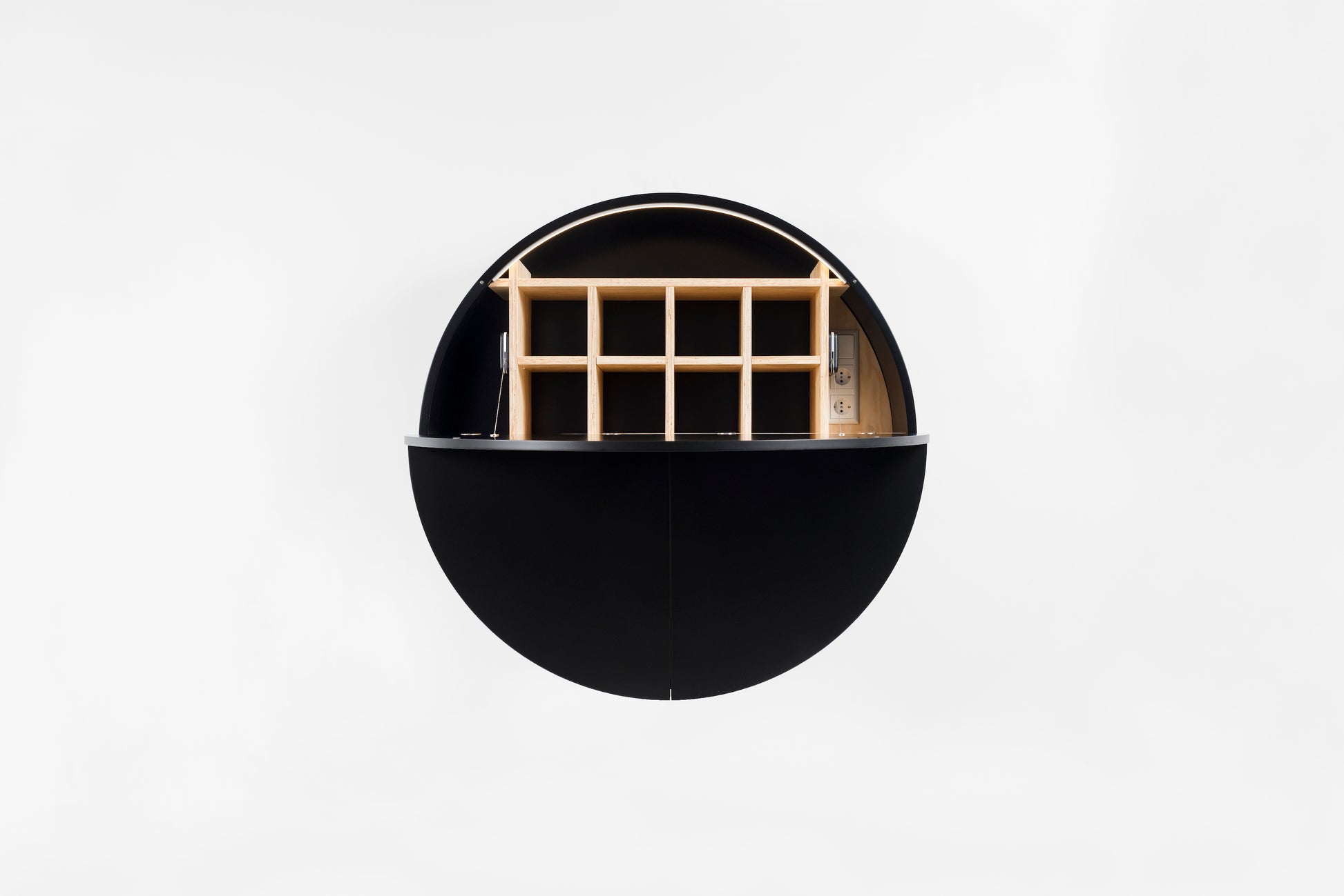 This Award-winning Multifunctional Pill Cabinet in black base works great against clutter and messy environments. The Pill is a round cabinet that works fixed to a wall and can instantly transform into a fully functional working place, a dressing table, or even a bar!