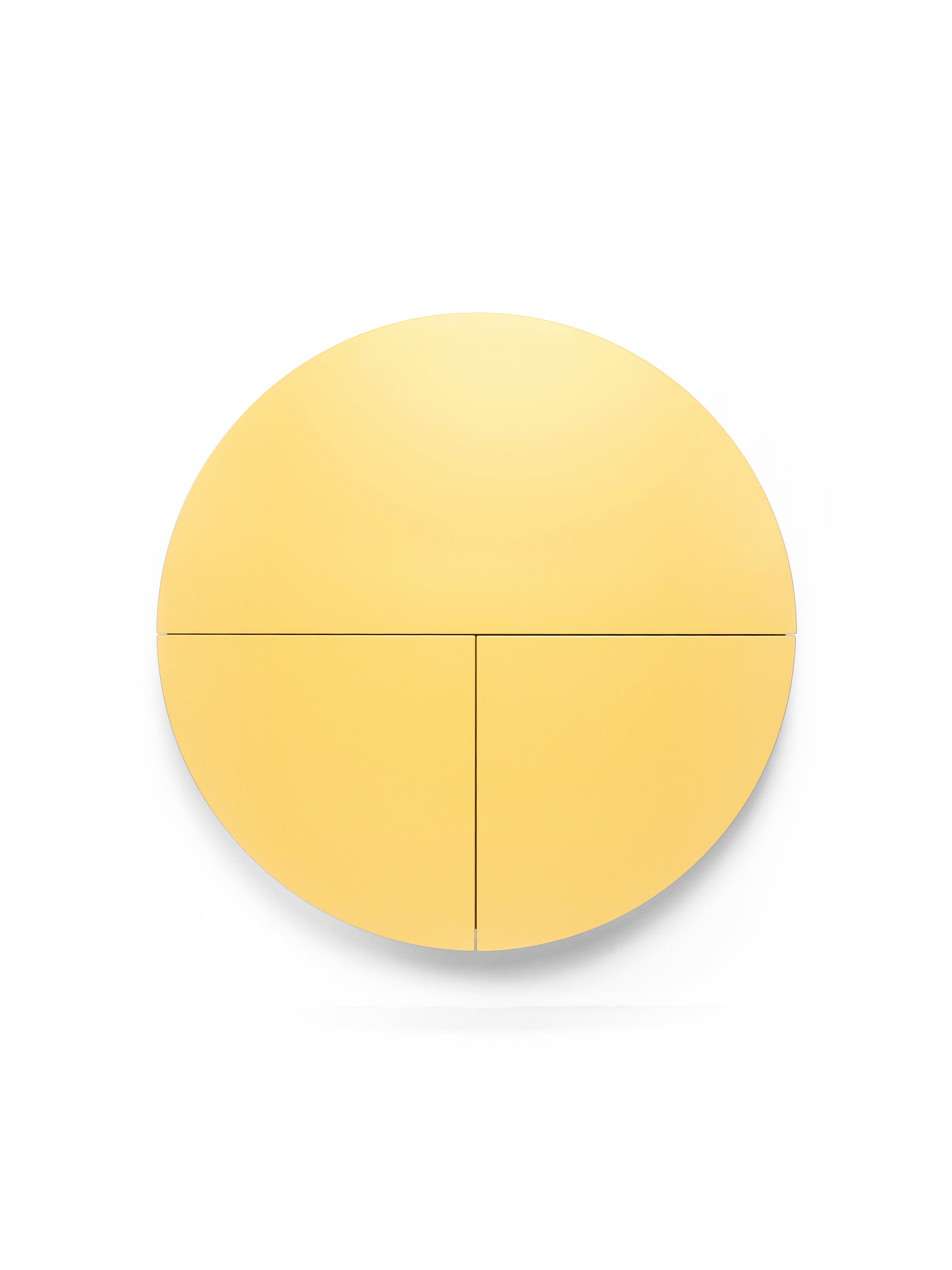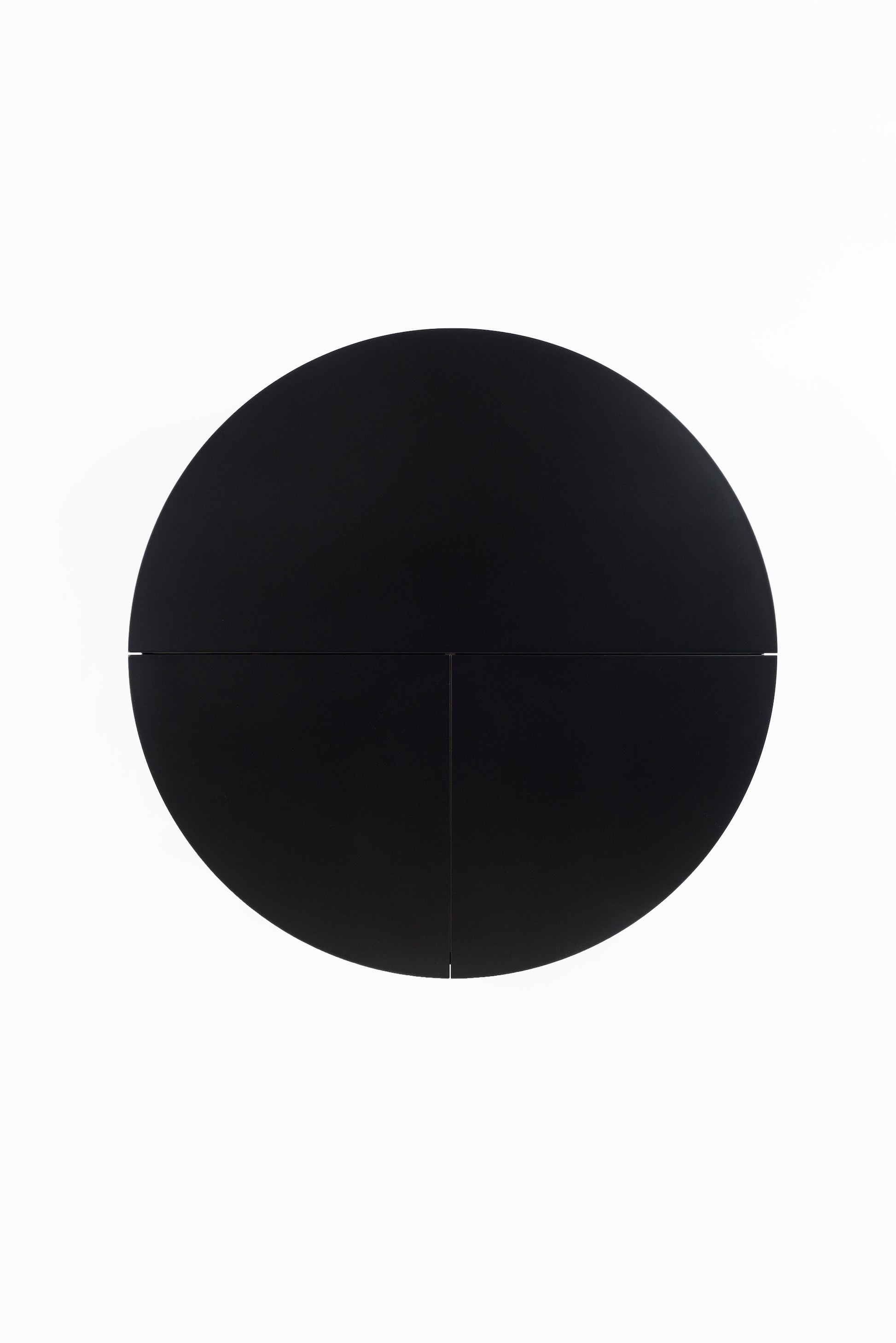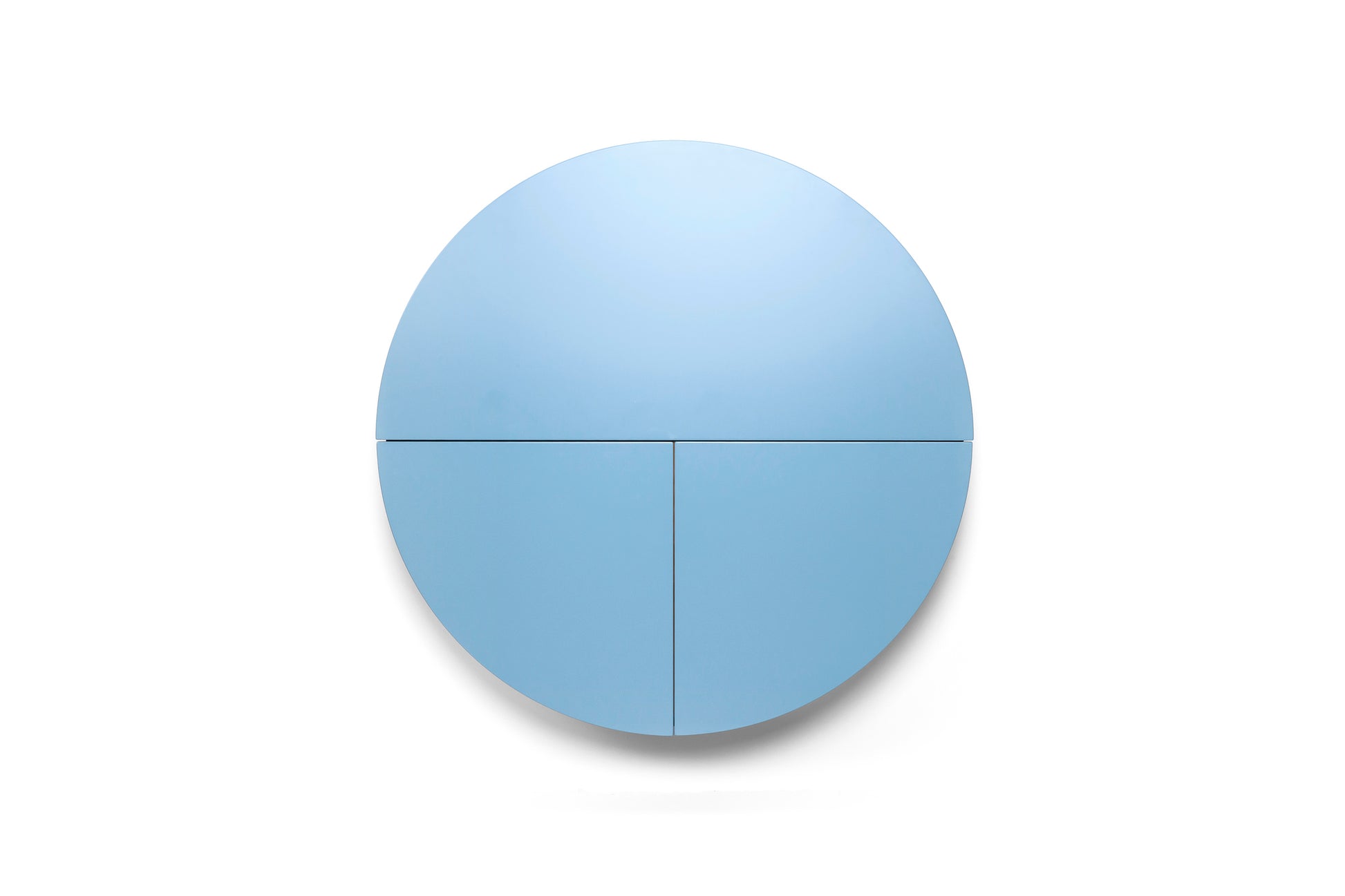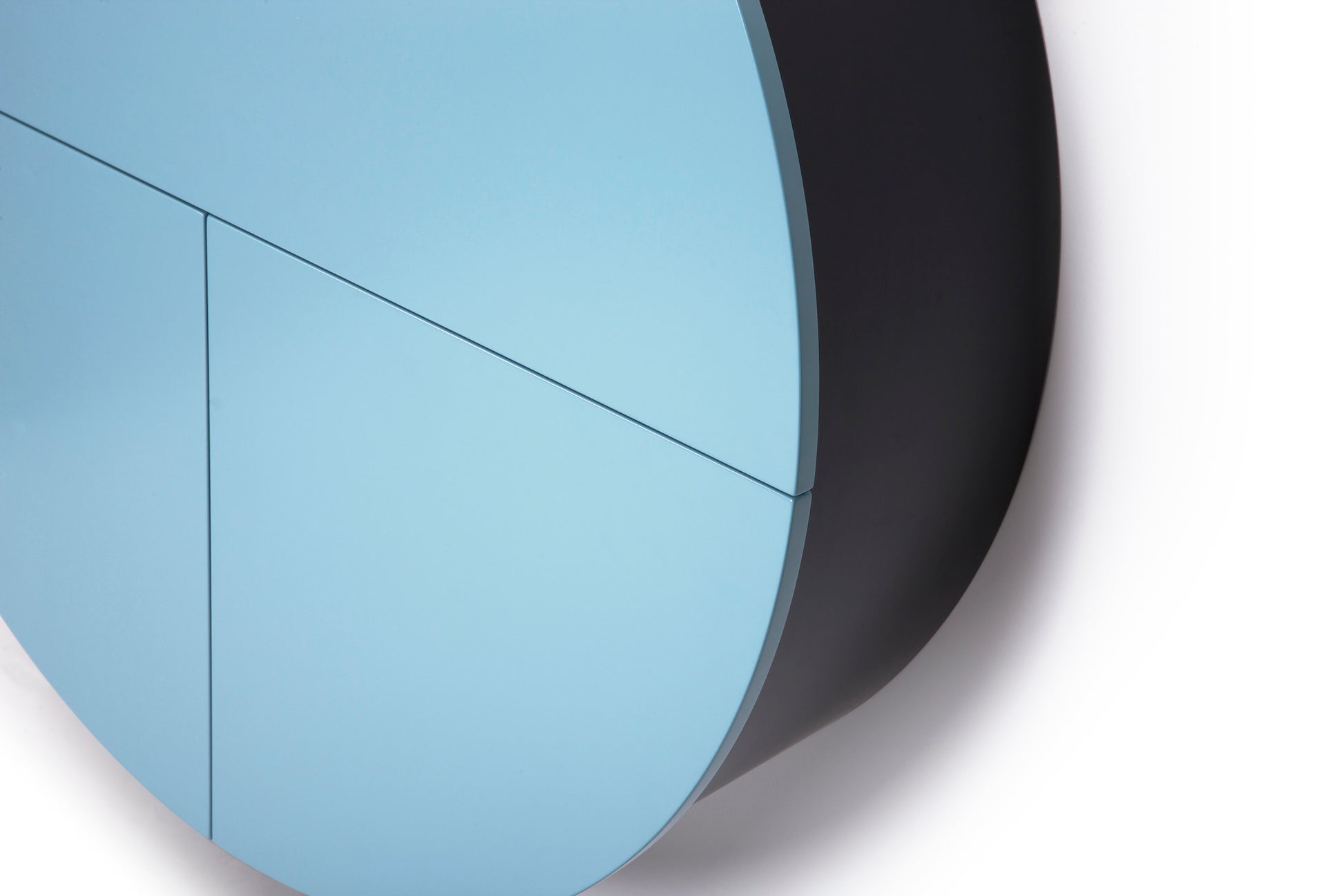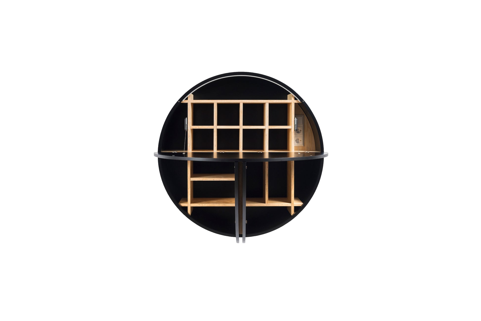 This Award-winning Multifunctional Pill Cabinet in black base works great against clutter and messy environments. The Pill is a round cabinet that works fixed to a wall and can instantly transform into a fully functional working place, a dressing table, or even a bar!