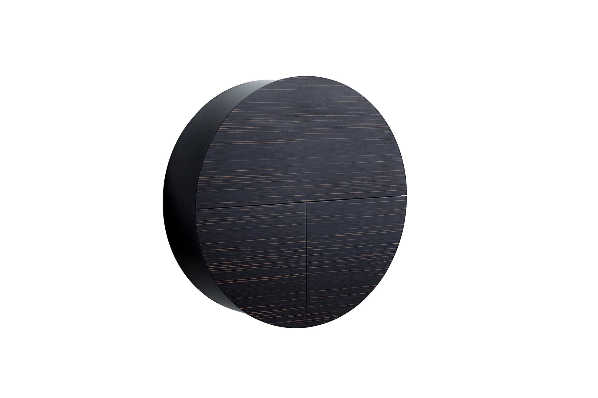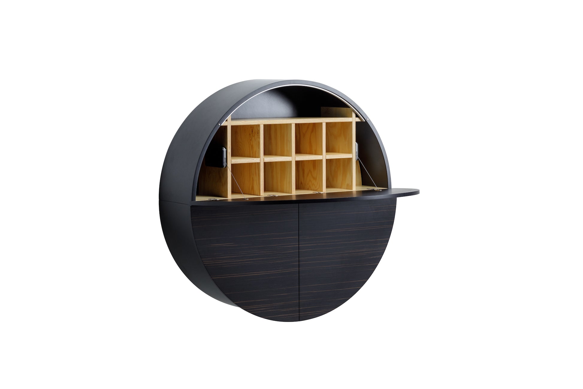 The Award-winning Multifunctional Pill Cabinet works great against clutter and messy environments. The Pill is a round cabinet that works fixed to a wall and can instantly transform into a fully functional working place, a dressing table, or even a bar!