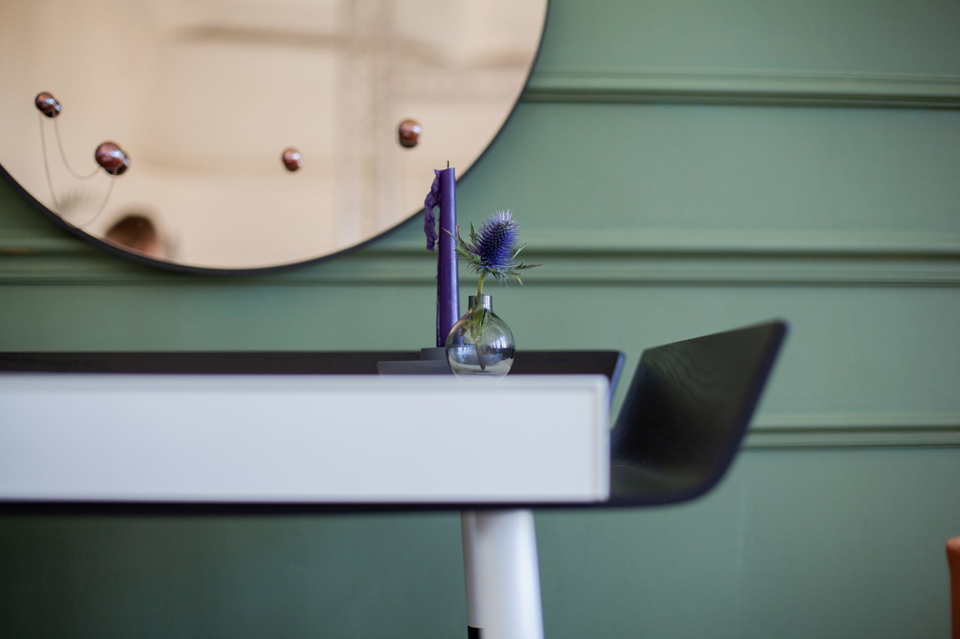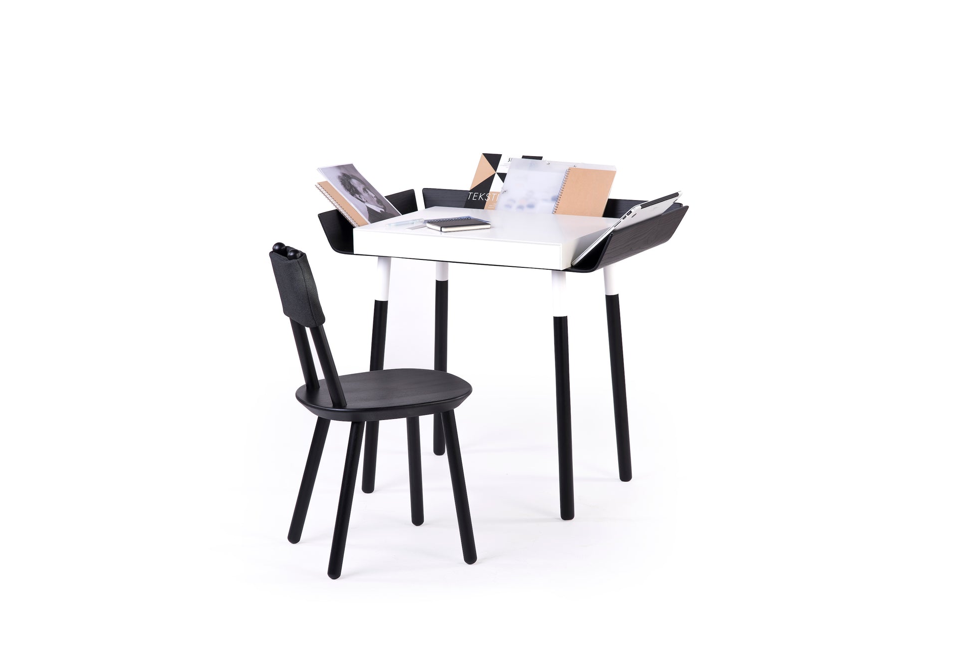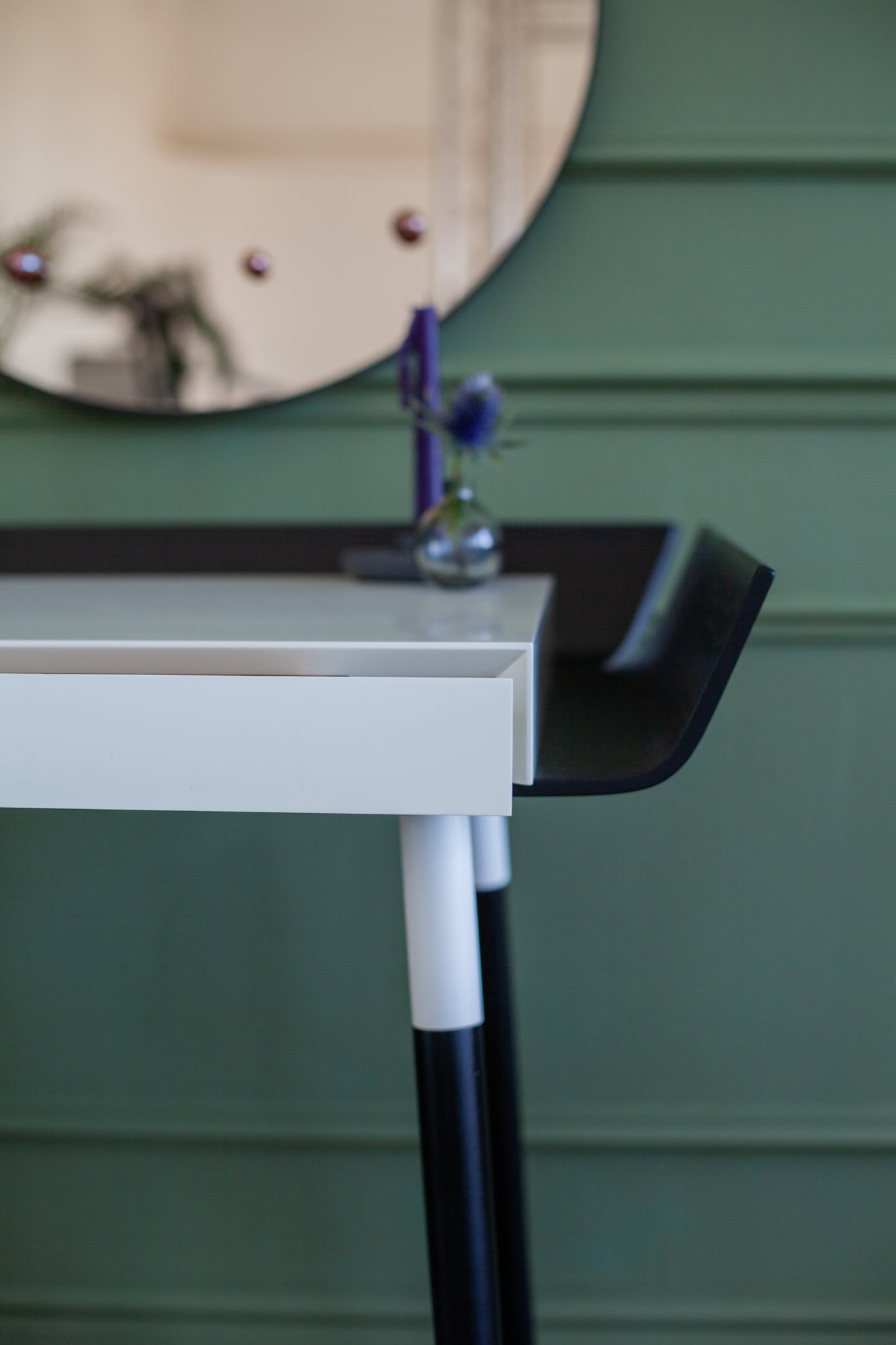 The high edges of the desk isolate it in the room and create a positive microclimate where things “feel good” in relationship to the user. The wings are divided, leaving space for the electrical wires.