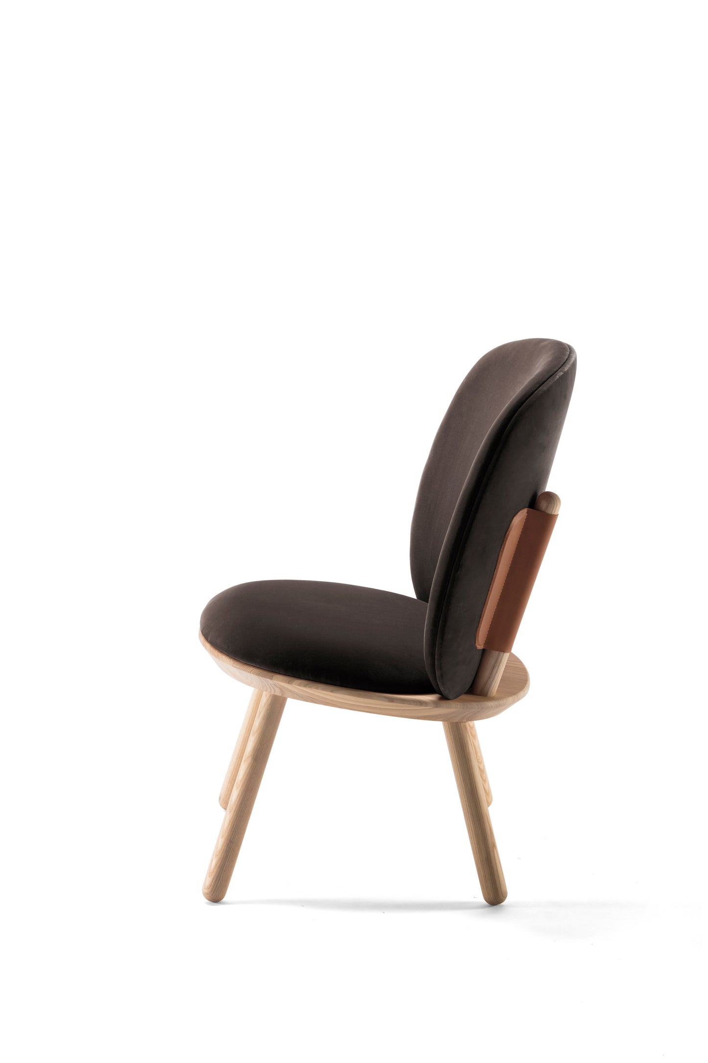 Being the youngest member of the Naïve family, Naïve Low Chair introduces itself with a bright, yet mature and subtle look. This made-to-order accent chair features a large leather strap that holds the backrest attached to the body. A firm connection between wood, leather, and textile serves its function and makes it visually distinctive.