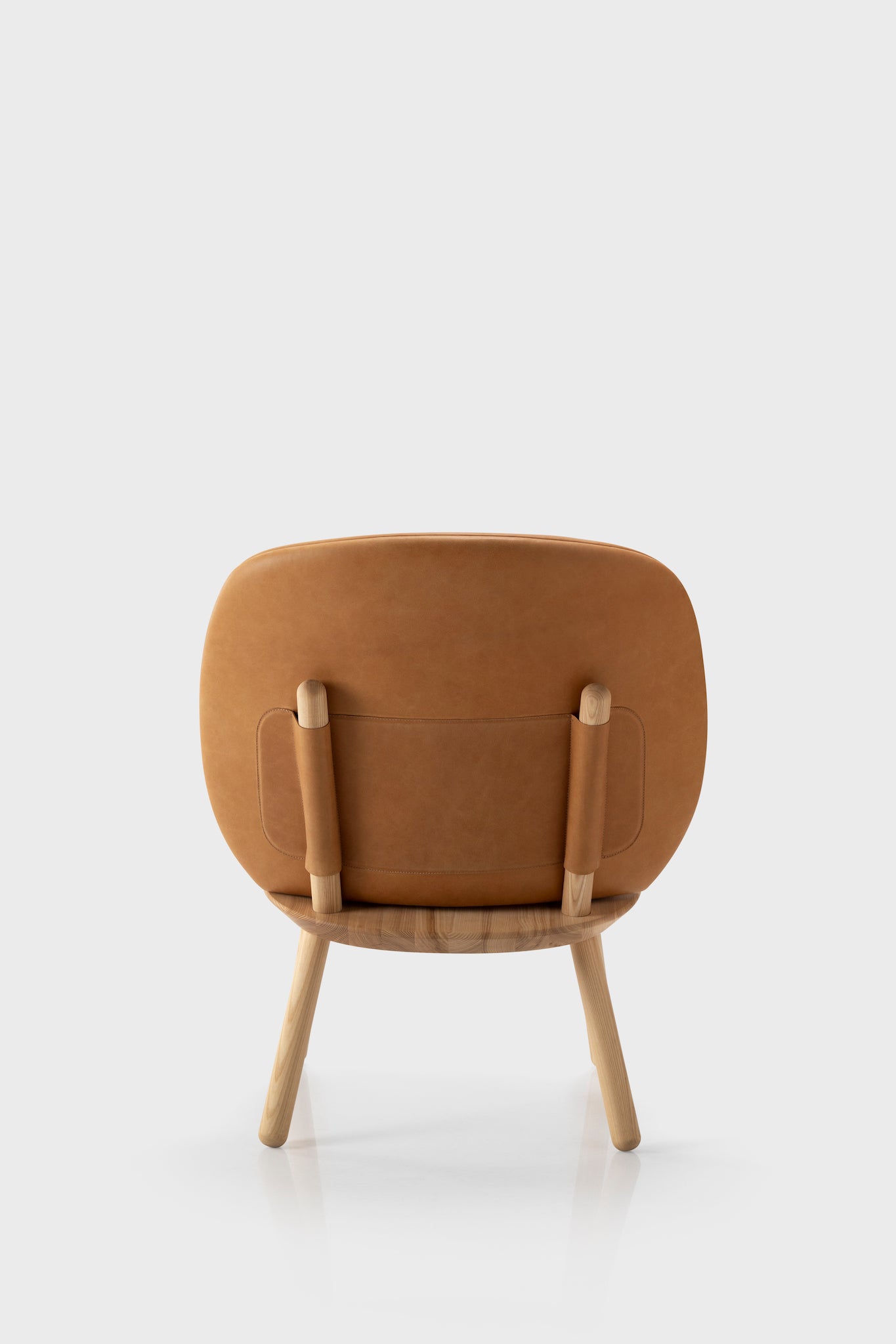Being the youngest member of the Naïve family, Naïve Low Chair introduces itself with a bright, yet mature and subtle look. This made-to-order accent chair features a large leather strap that holds the backrest attached to the body. A firm connection between wood and leather serves its function and makes it visually distinctive.