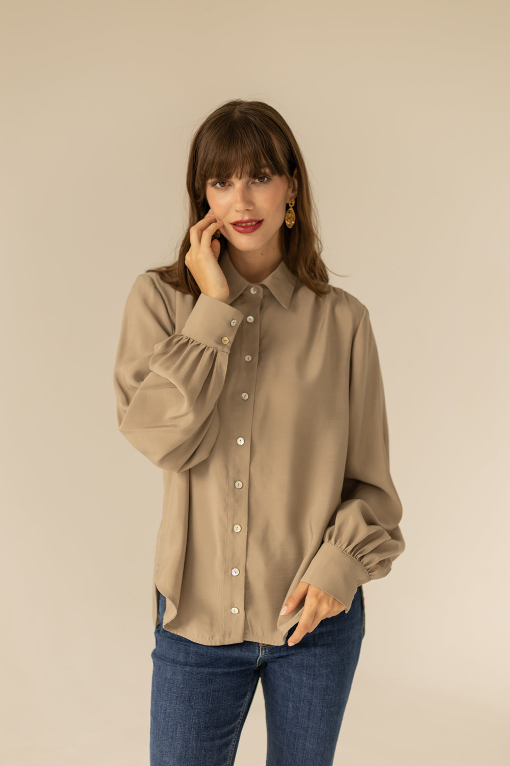 It is made of airy viscose fabric (OEKO TEX Certified), with buttons made of mother-of-pearl in the tone of the fabric.