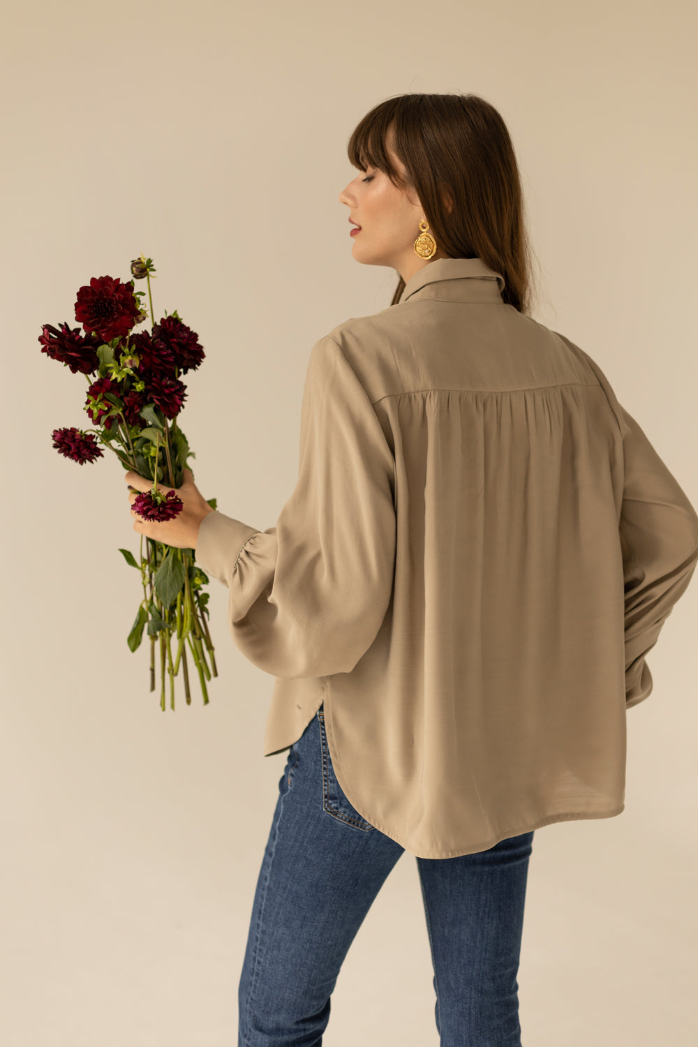 SOMEFANCYNAME.COM brings you this locally-made Noel Oversized Shirt - Beige. It features classic sewn-in shoulders and slightly gathered puffed sleeves with elegant two-button cuffs and a rounded bottom.
