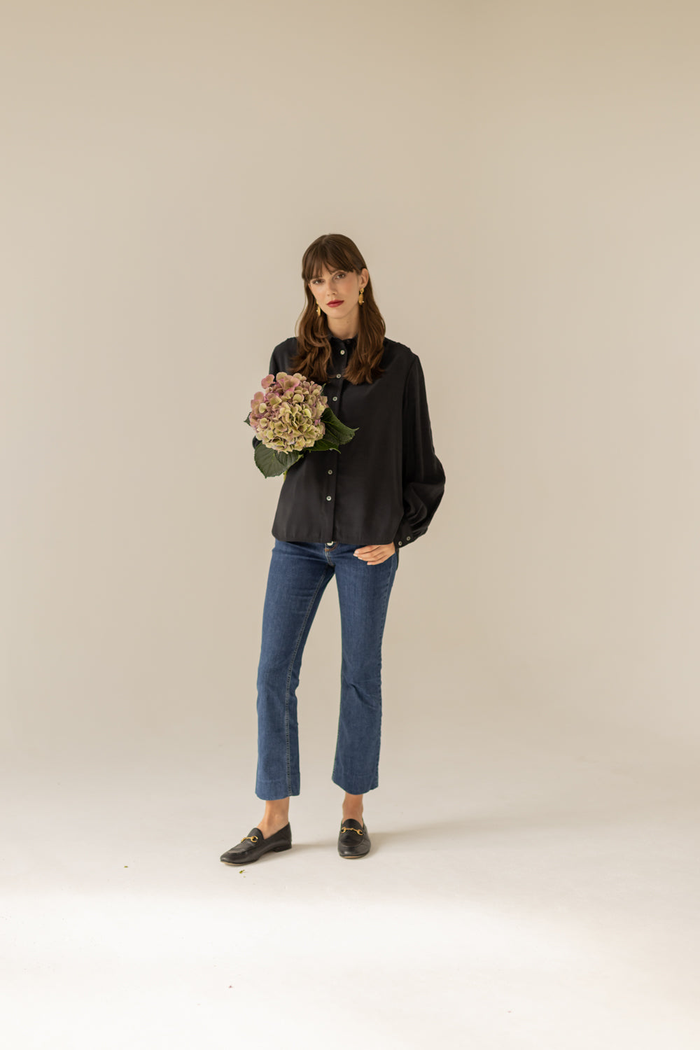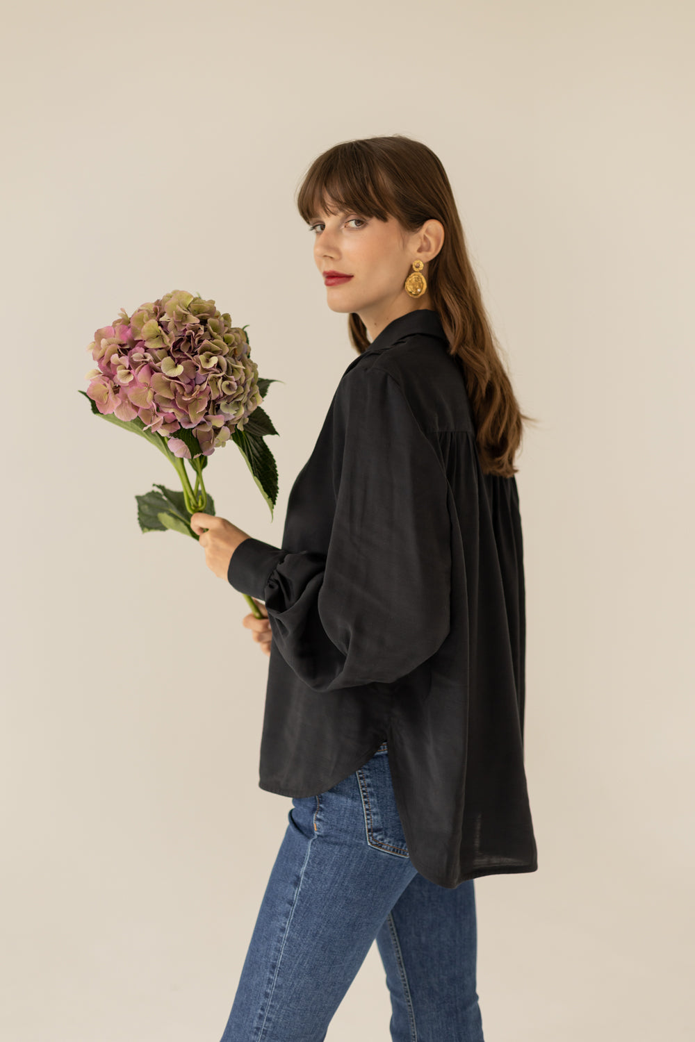 SOMEFANCYNAME.COM brings you this locally-made Noel Oversized Shirt - Black. It features classic sewn-in shoulders and slightly gathered puffed sleeves with elegant two-button cuffs and a rounded bottom.