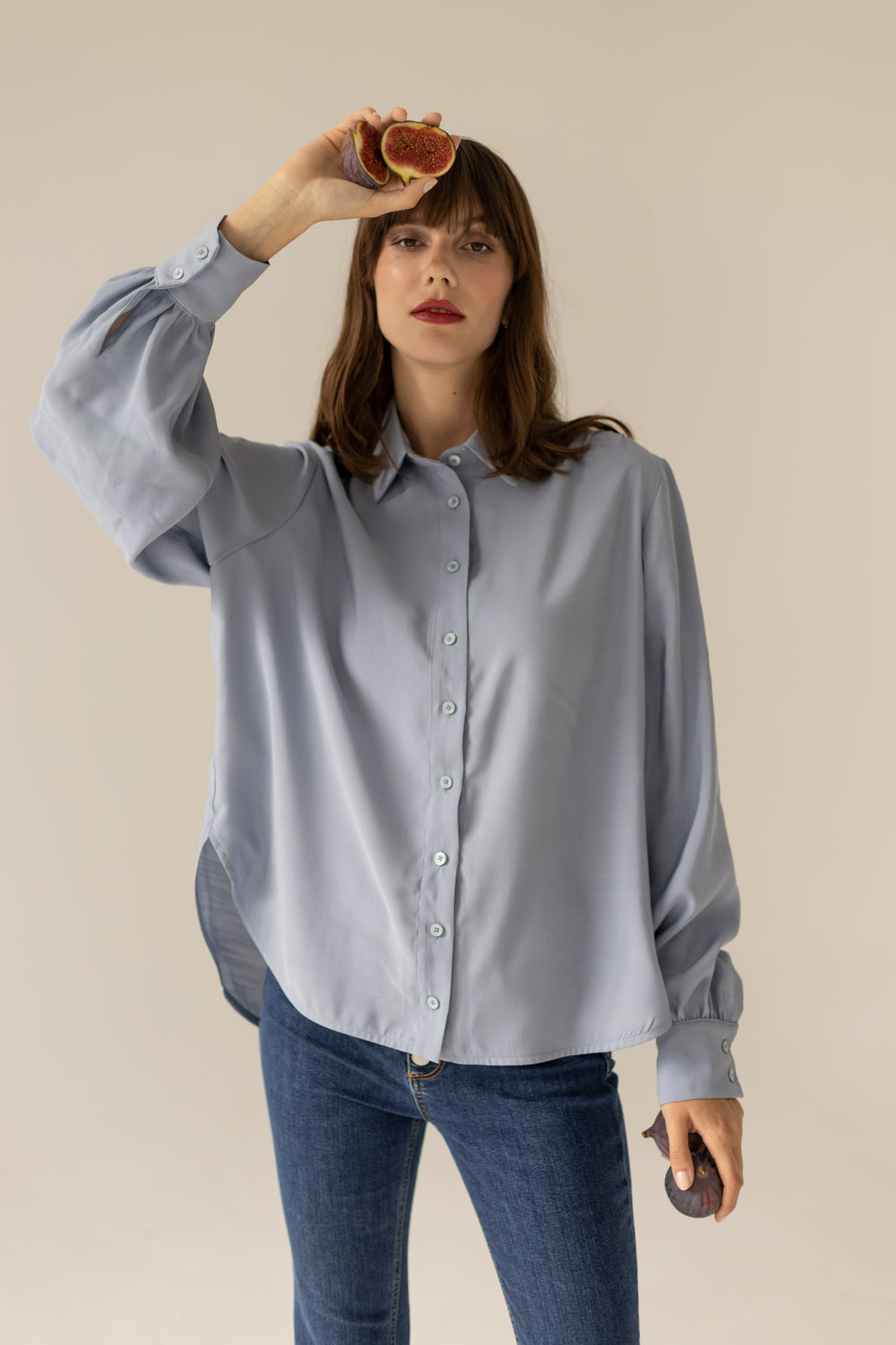 SOMEFANCYNAME.COM brings you this locally-made Noel Oversized Shirt - Blue. It features classic sewn-in shoulders and slightly gathered puffed sleeves with elegant two-button cuffs and a rounded bottom.