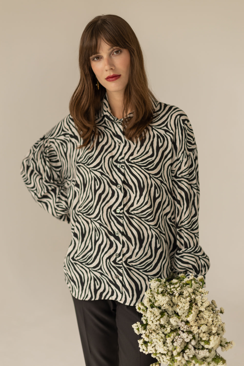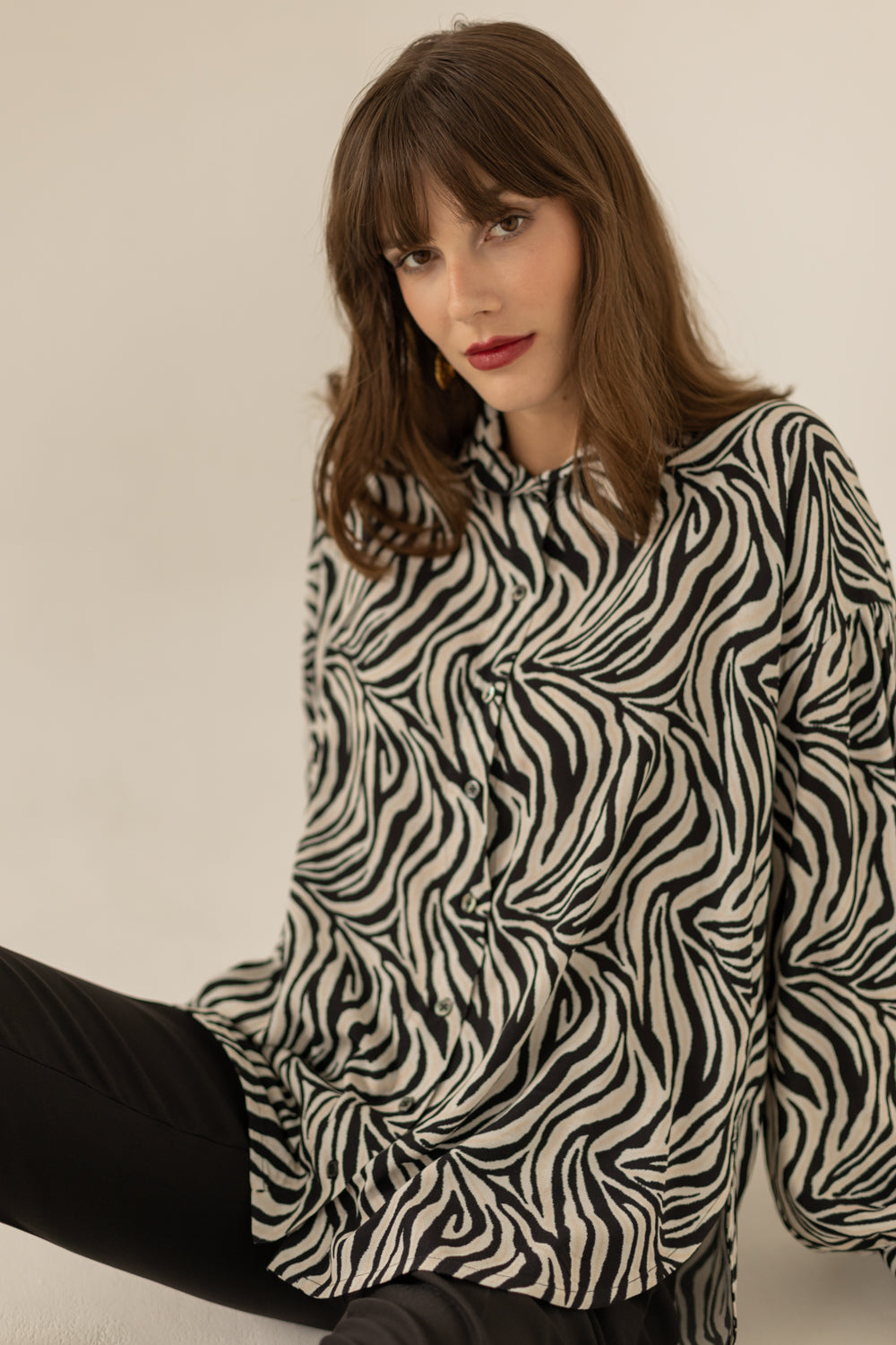 SOMEFANCYNAME.COM brings you this locally-made Noel Oversized Shirt - Zebra Print. It features classic sewn-in shoulders and slightly gathered puffed sleeves with elegant two-button cuffs and a rounded bottom.