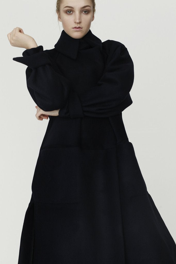 A Unisex wide-silhouette coat with stain-collar in 100% thick wool features squared upper side pockets, folded triangle shoulder, placket front and cuffs. Sophisticated geometric stitches accentuate the coat.