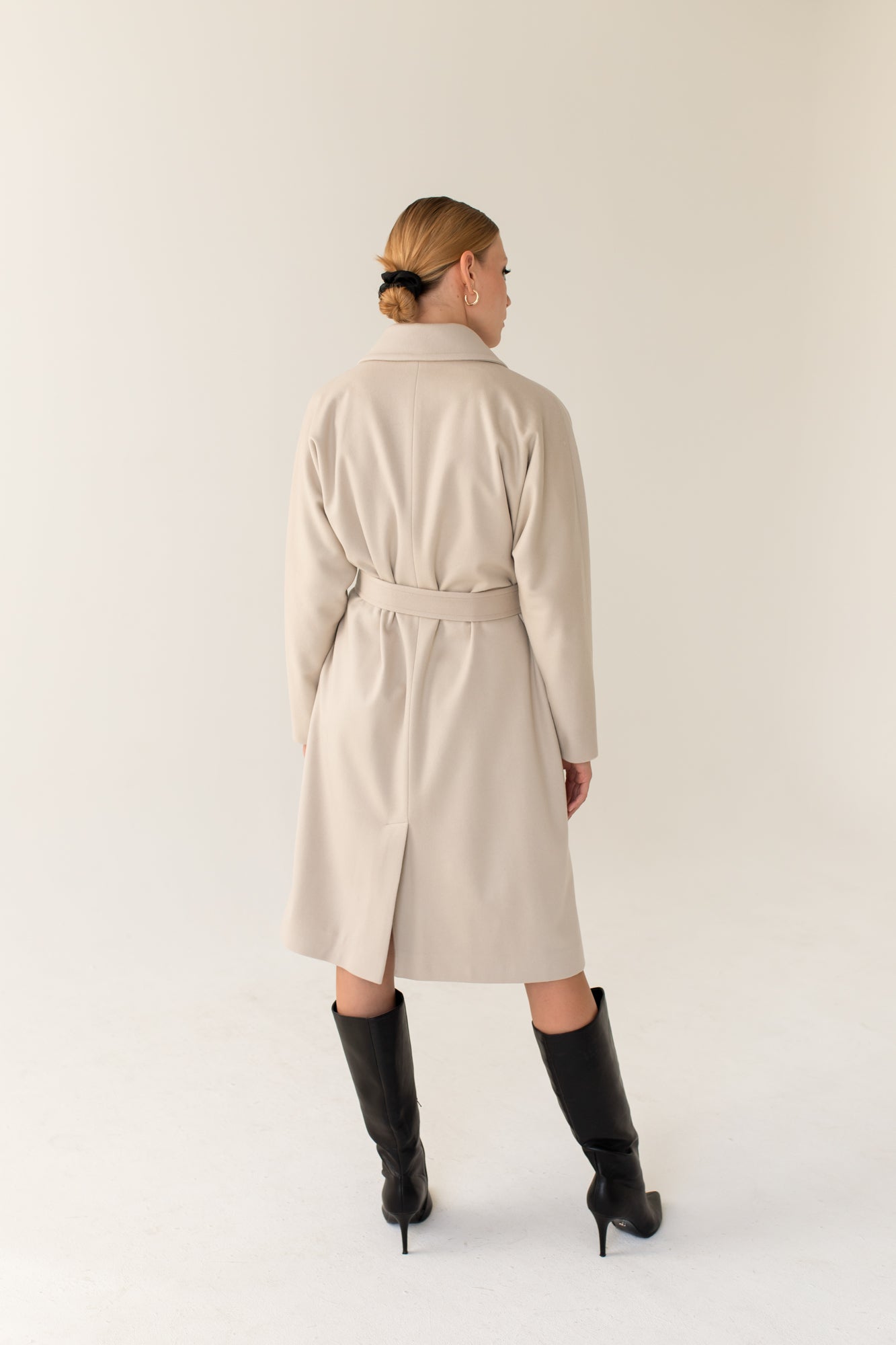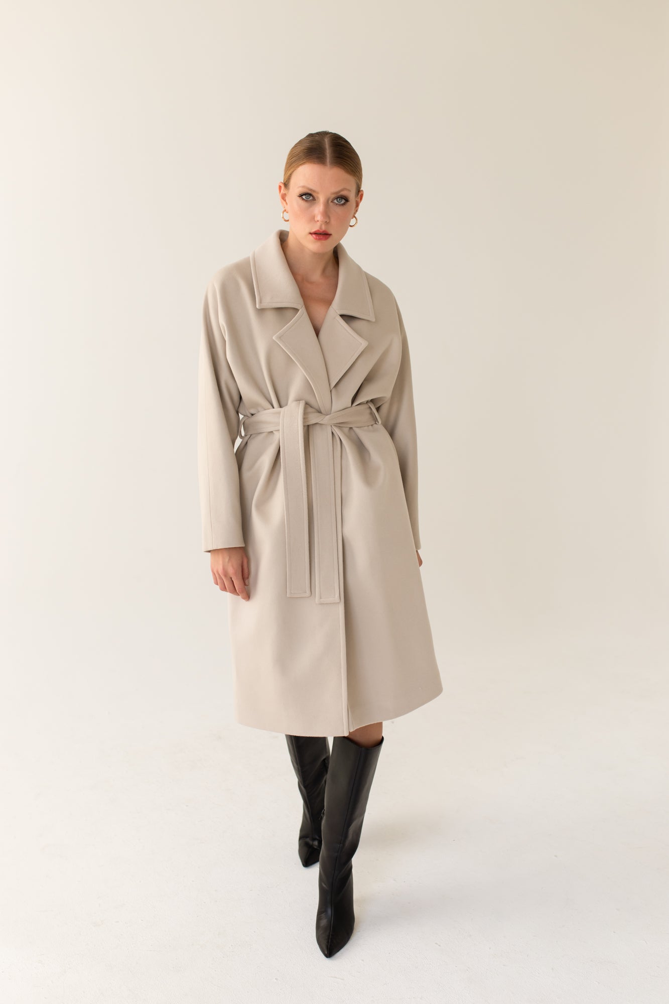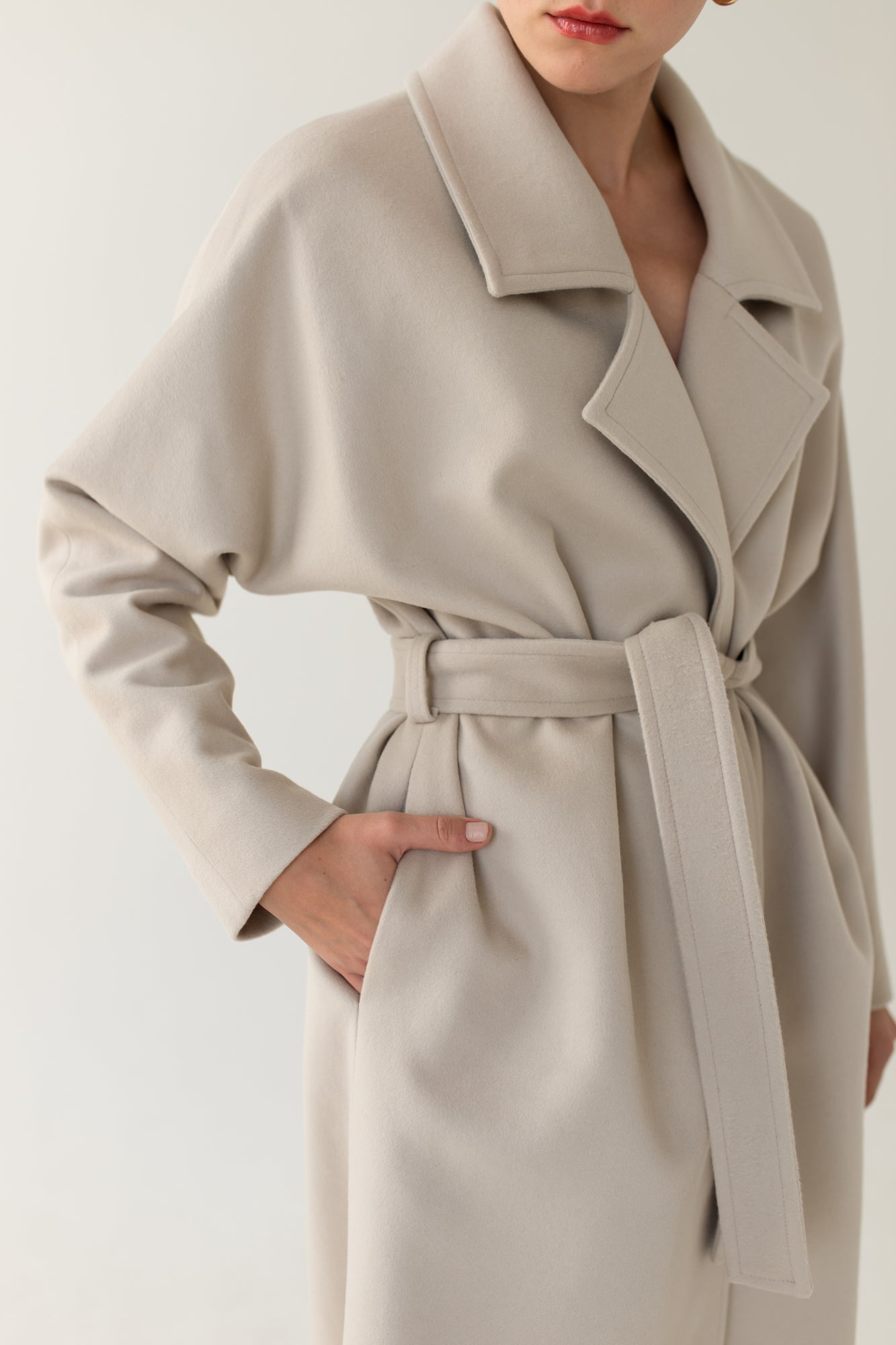 SOMEFANCYNAME.COM presents you with this light beige cashmere oversized coat. This winter coat features a loose cut with kimono sleeves, tied with a belt, with pockets hidden in the seam; decorative stitching on the collar, pockets, and belt.