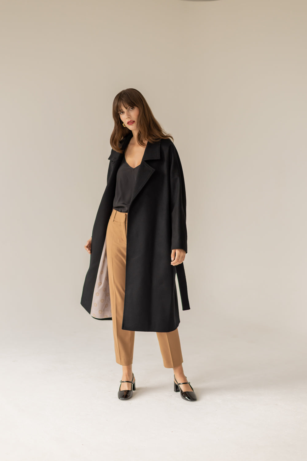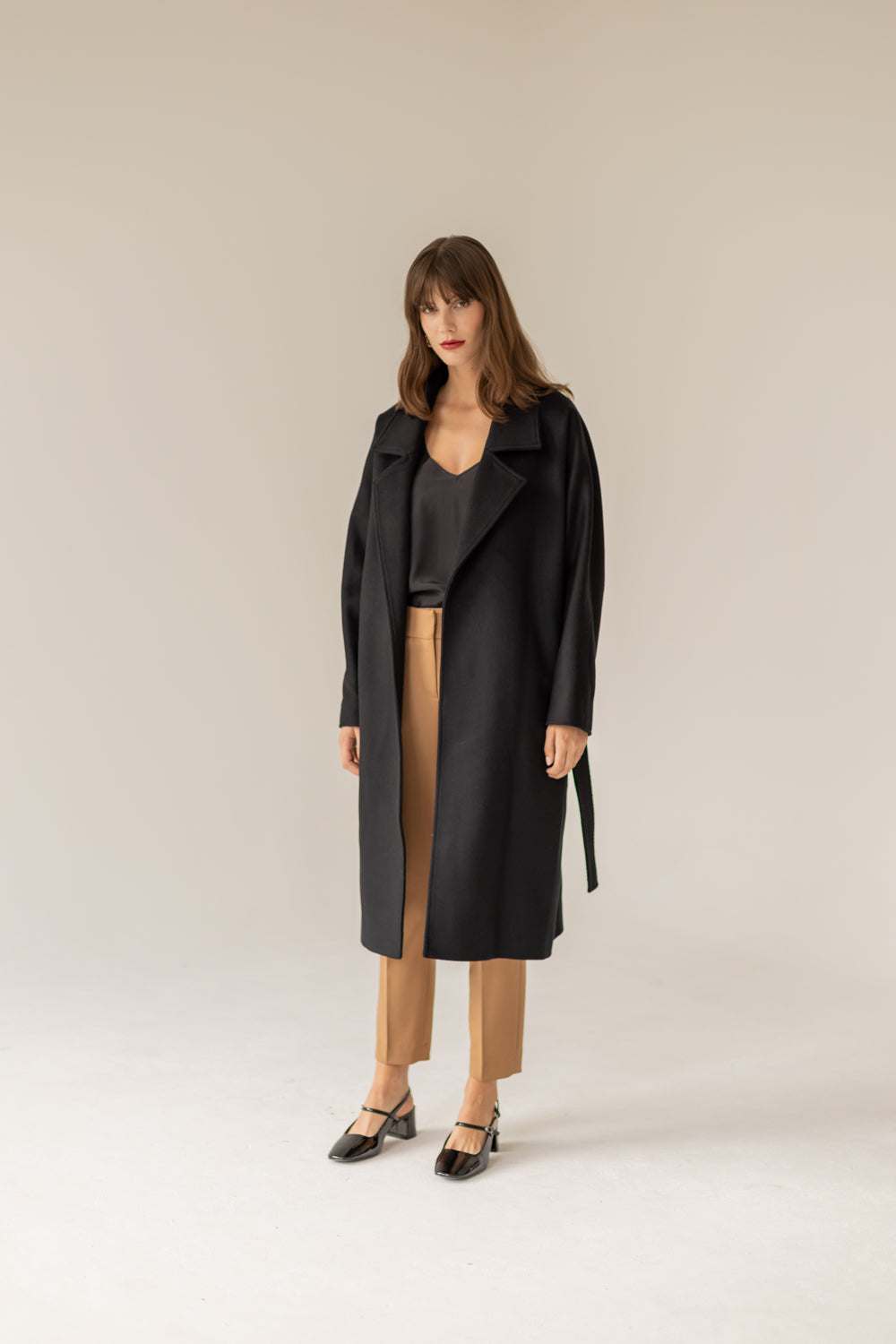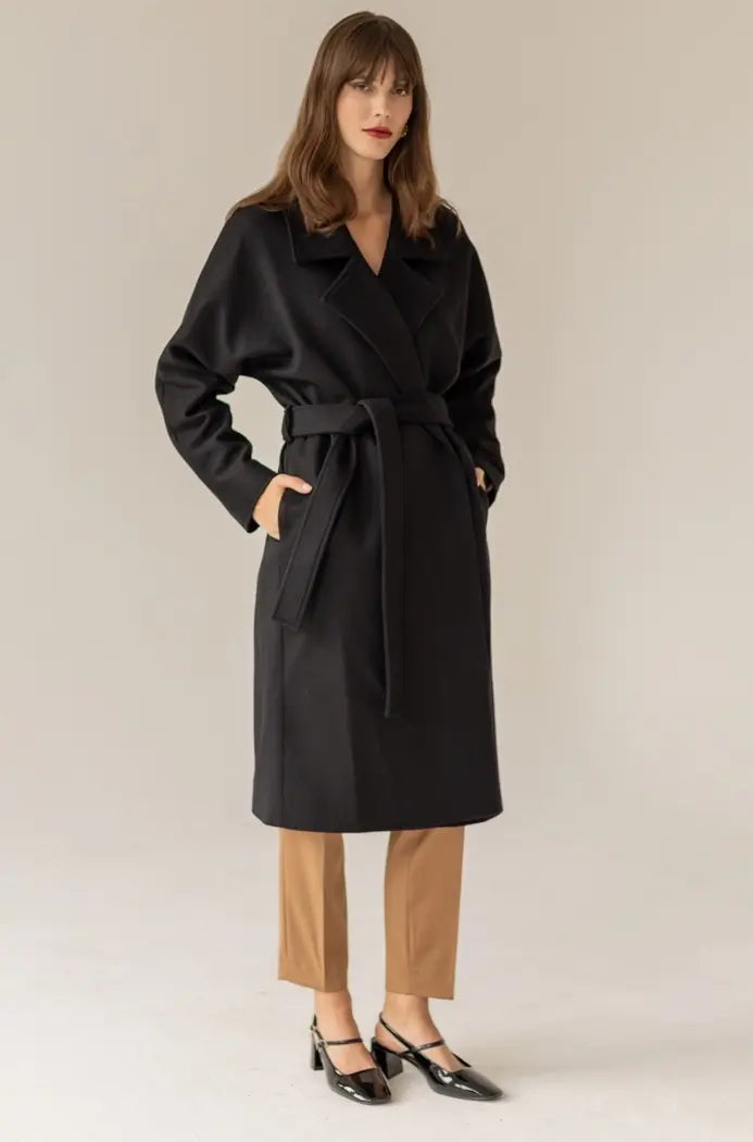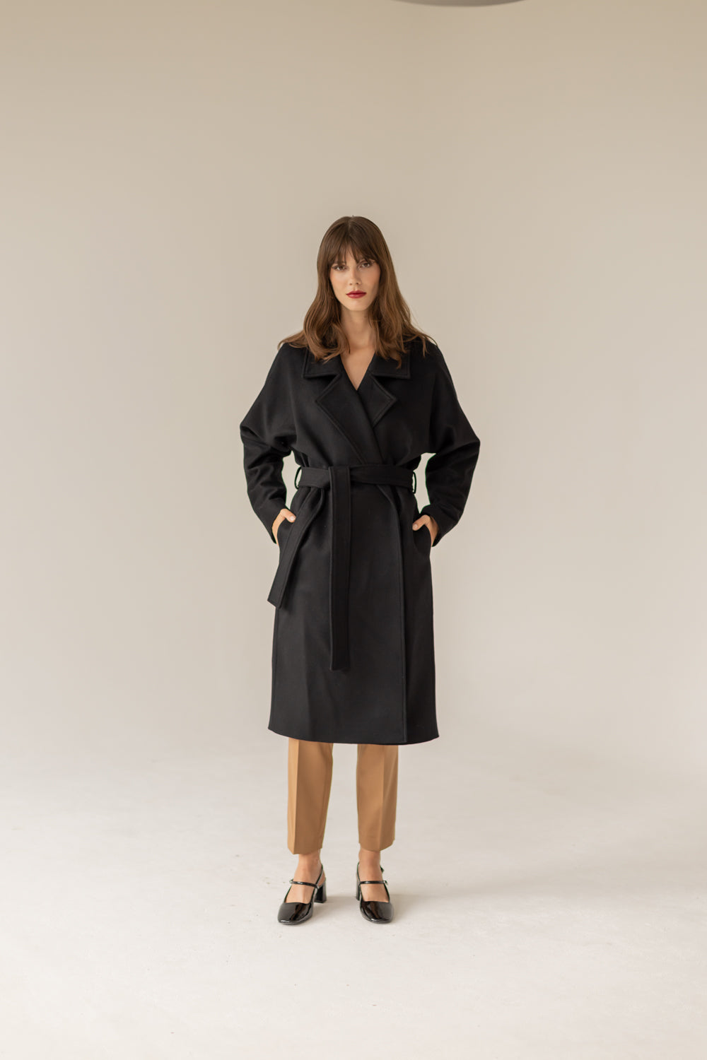 SOMEFANCYNAME.COM presents you with this Oversized Cashmere Wool Coat - Black. This winter coat features a brand logo lining, a loose cut with kimono sleeves, tied with a belt, and pockets hidden in the seam.