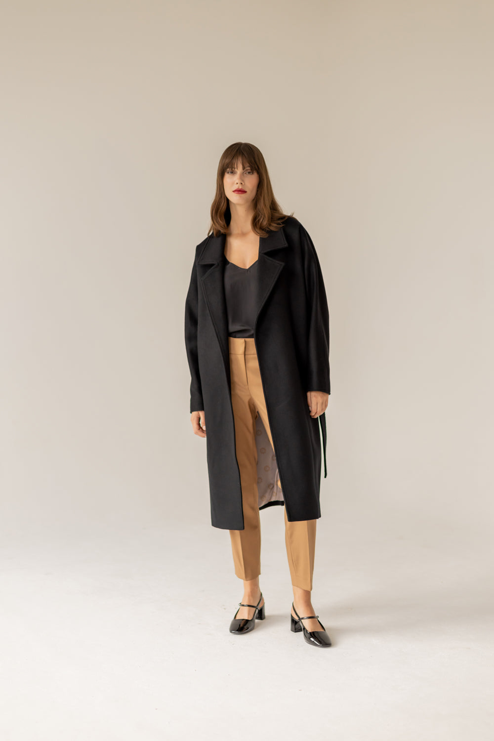 The coat is made of a soft fleece blend of wool and cashmere, with short, slightly visible hair with a delicate satin sheen.