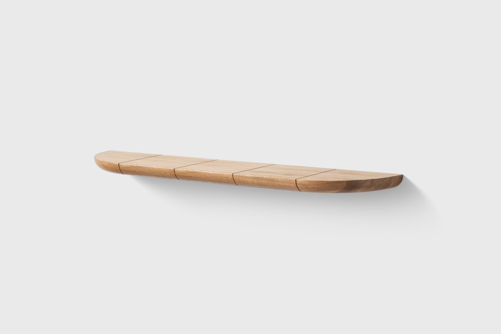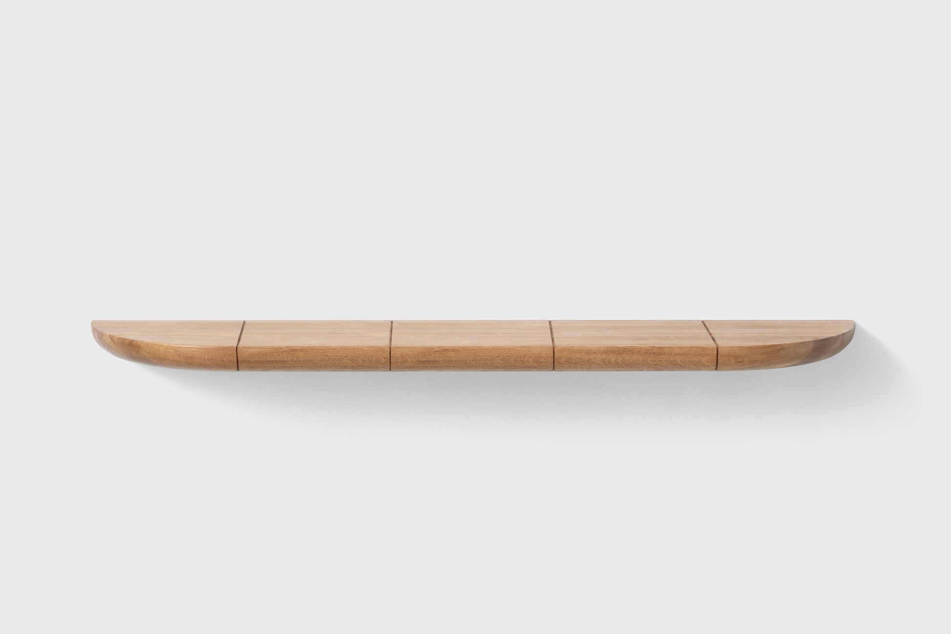 Wall-mounted Paragraph Shelf by etc.etc. studio is an excellent piece for both storage and display. These open shelves seem as if they are effortlessly floating on the wall. Yet, they are quite sturdy and designed to hold heavy items. Produced out of beautiful slabs of oak, these smooth shelves are also sustainable and highlight the eye-catching texture of wood.