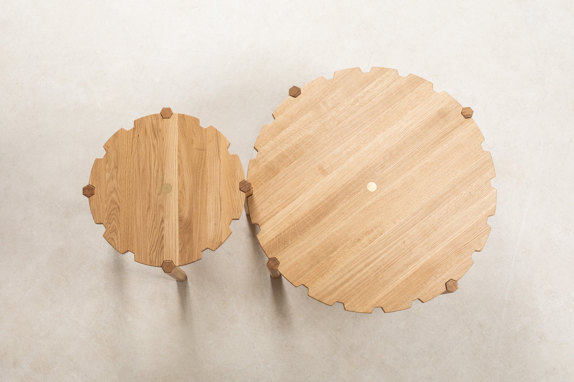 Pinion tables are available in three sizes and heights. Each table is made from oiled oak wood and features a round brass plate right at the center of the tabletop. This subtle detail not only adds a sophisticated touch but extends the concept of mechanics to the materials and final appearance of the table.