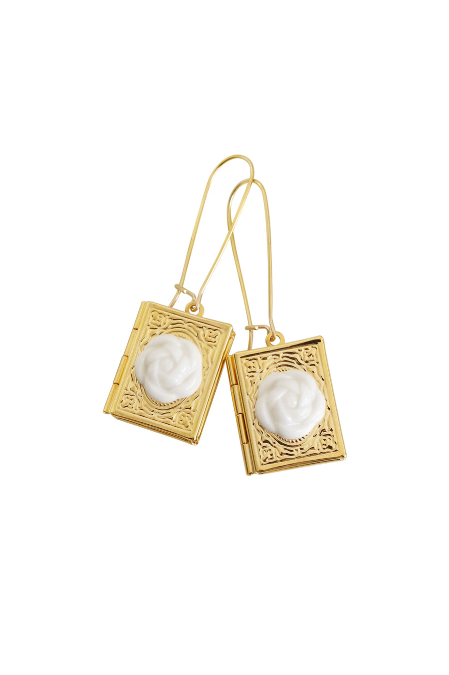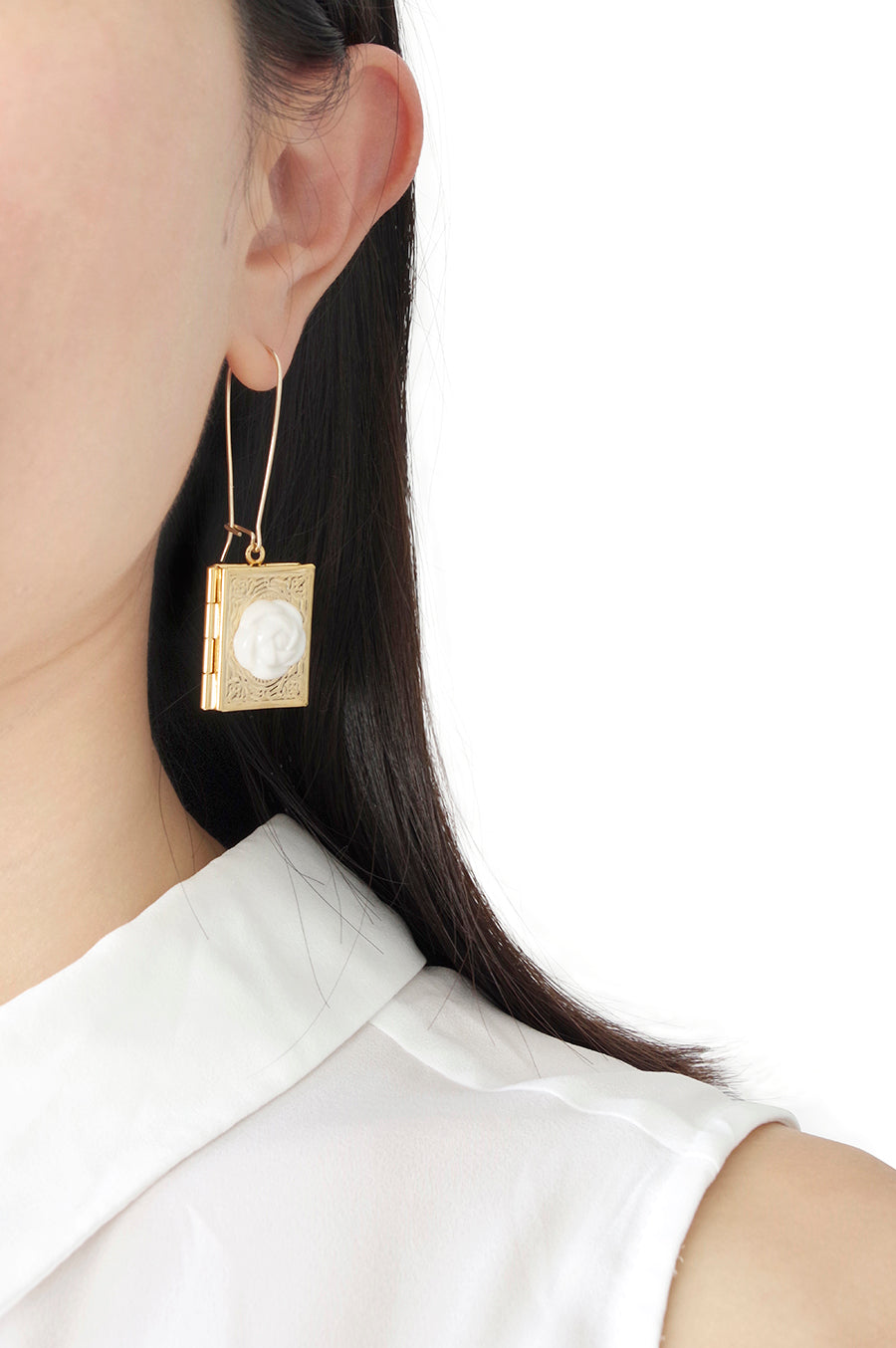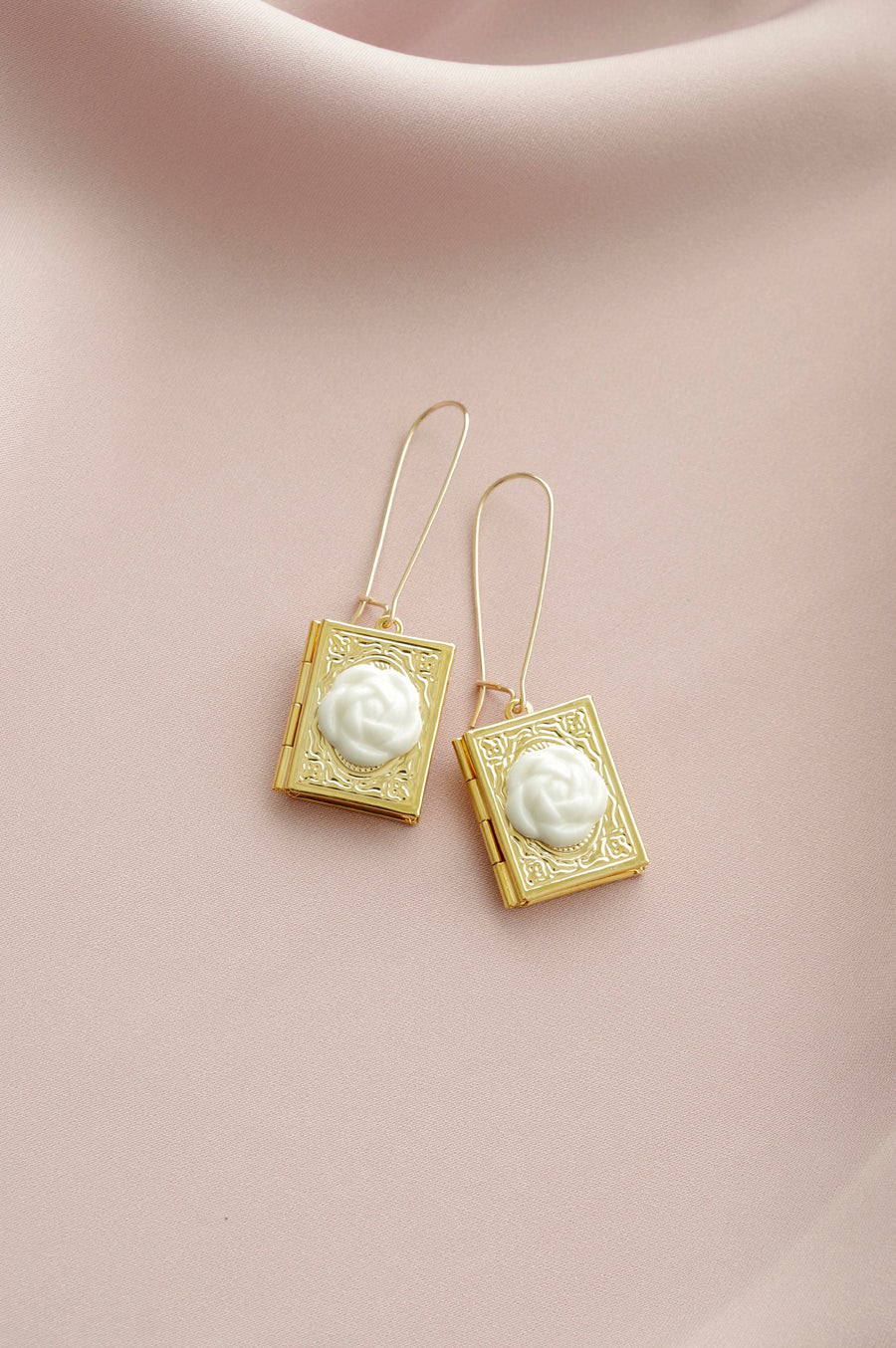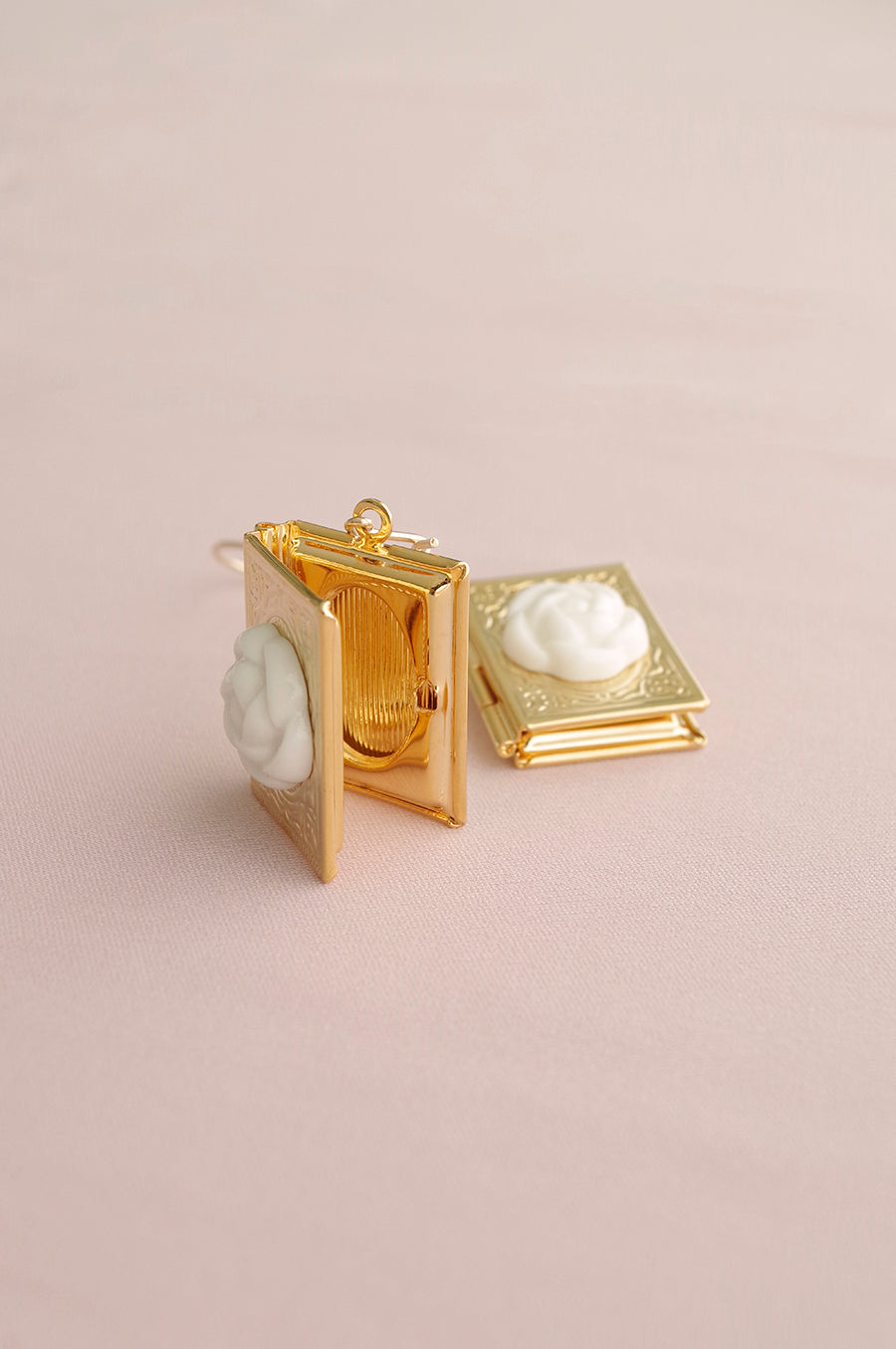 These snow-white camellias and vintage-style gold-plated book lockets create a nostalgic feel. The book lockets can be opened and used for storing your memorable moments.