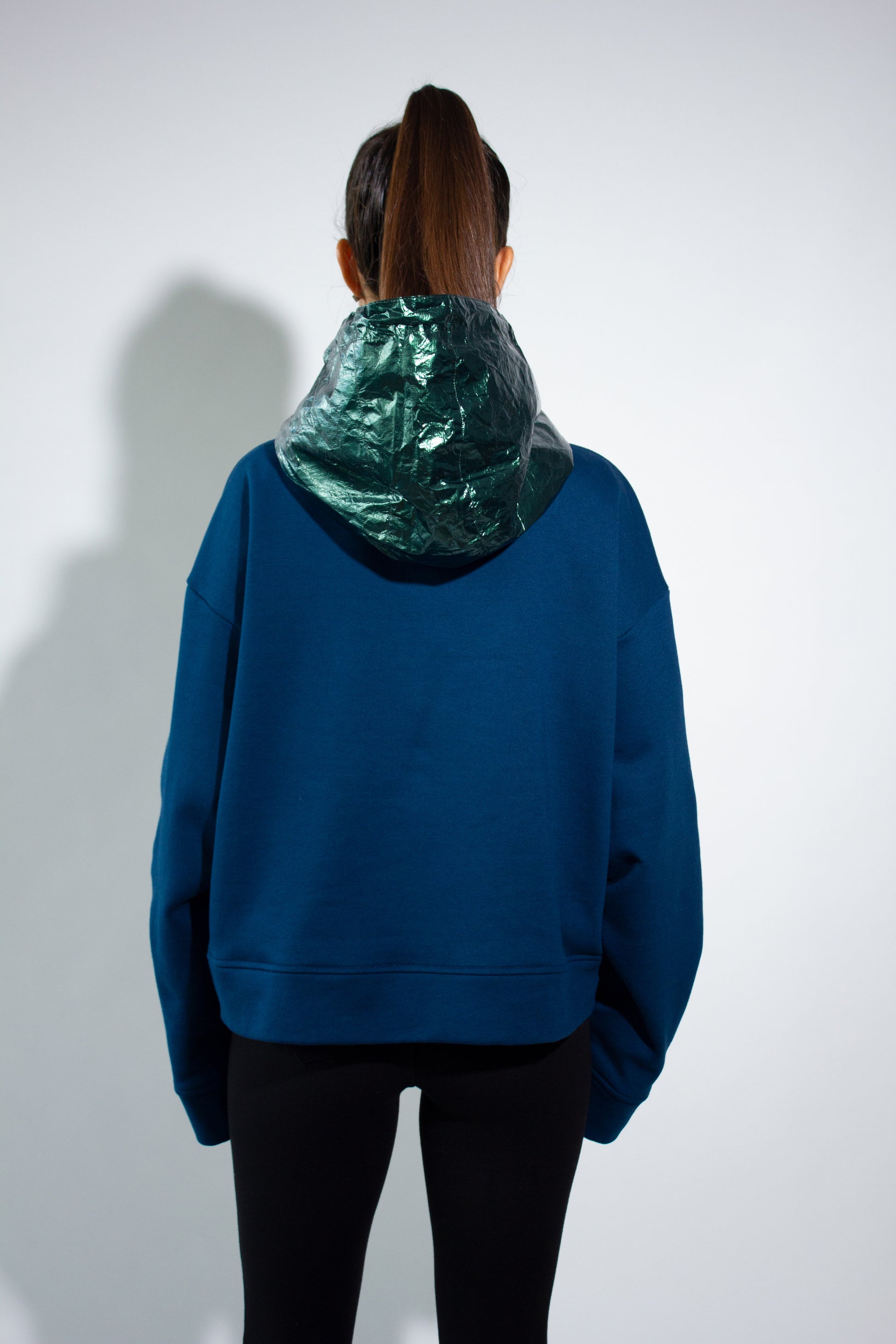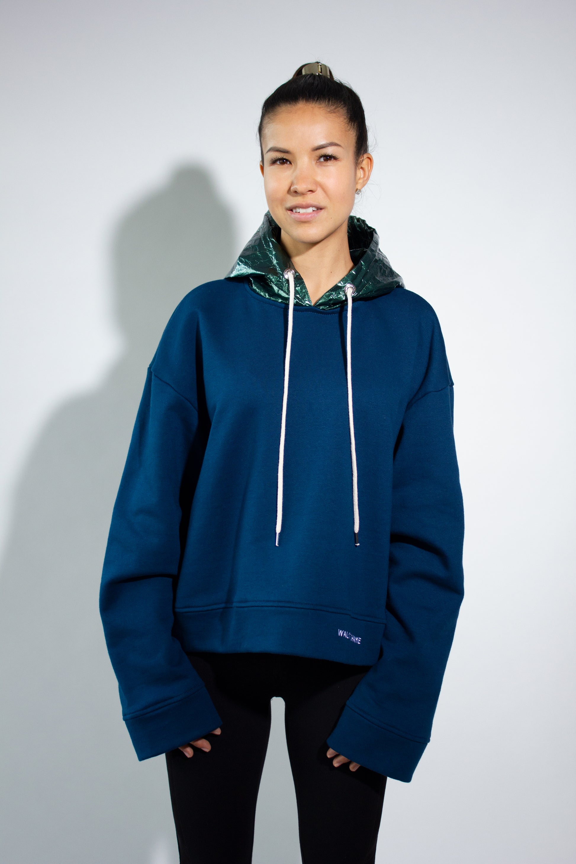 Dark blue cotton blend relaxed hoodie from WALK OF SHAME featuring a drawstring, plastic-covered hood, dropped shoulders and embroidered branding to the hem.
