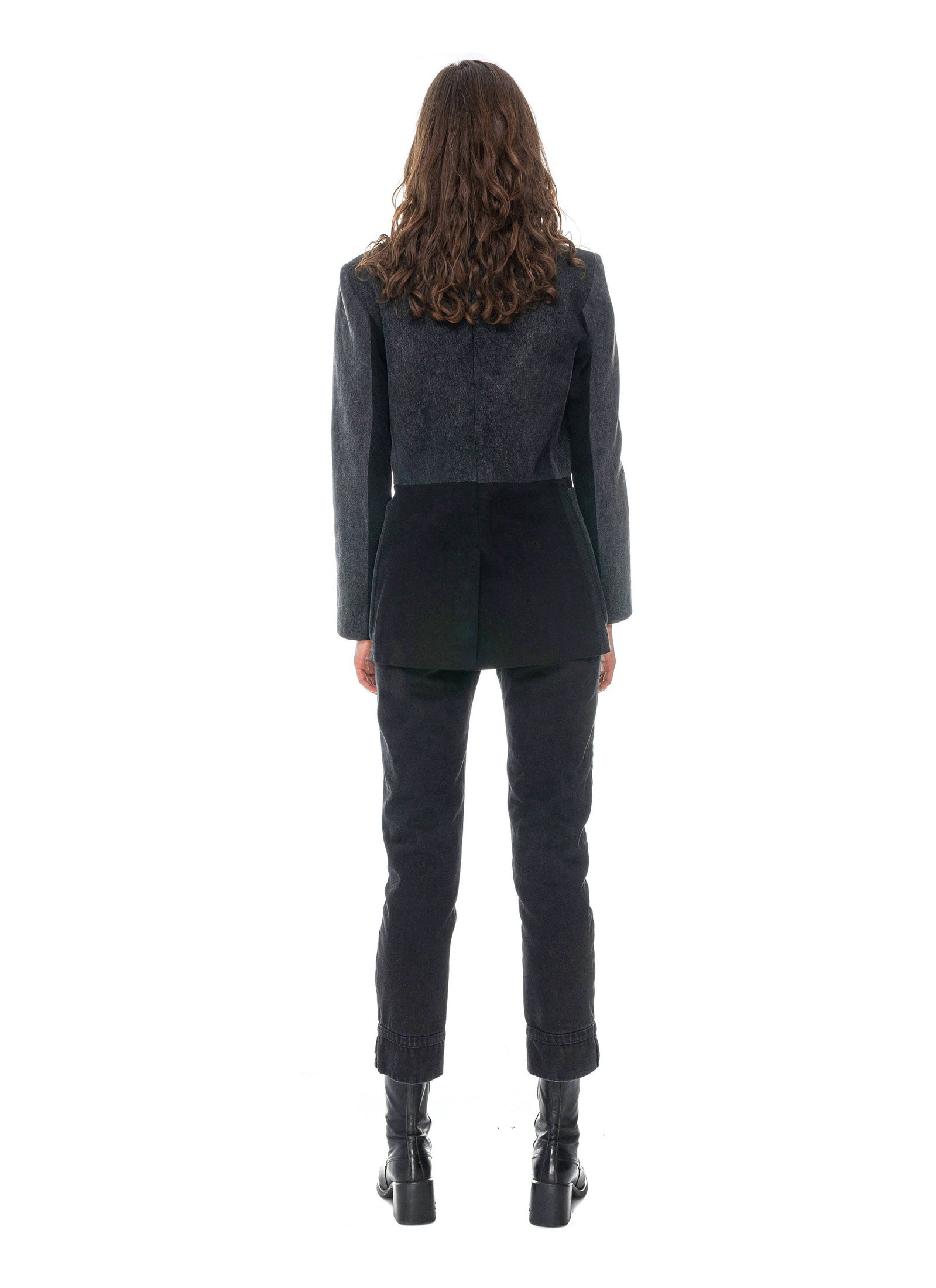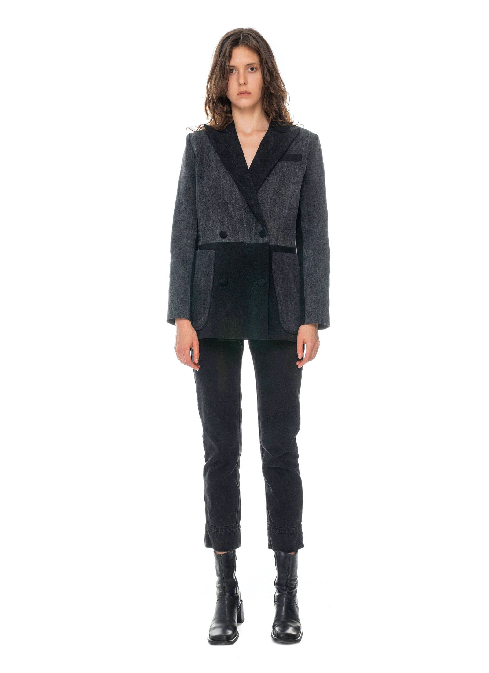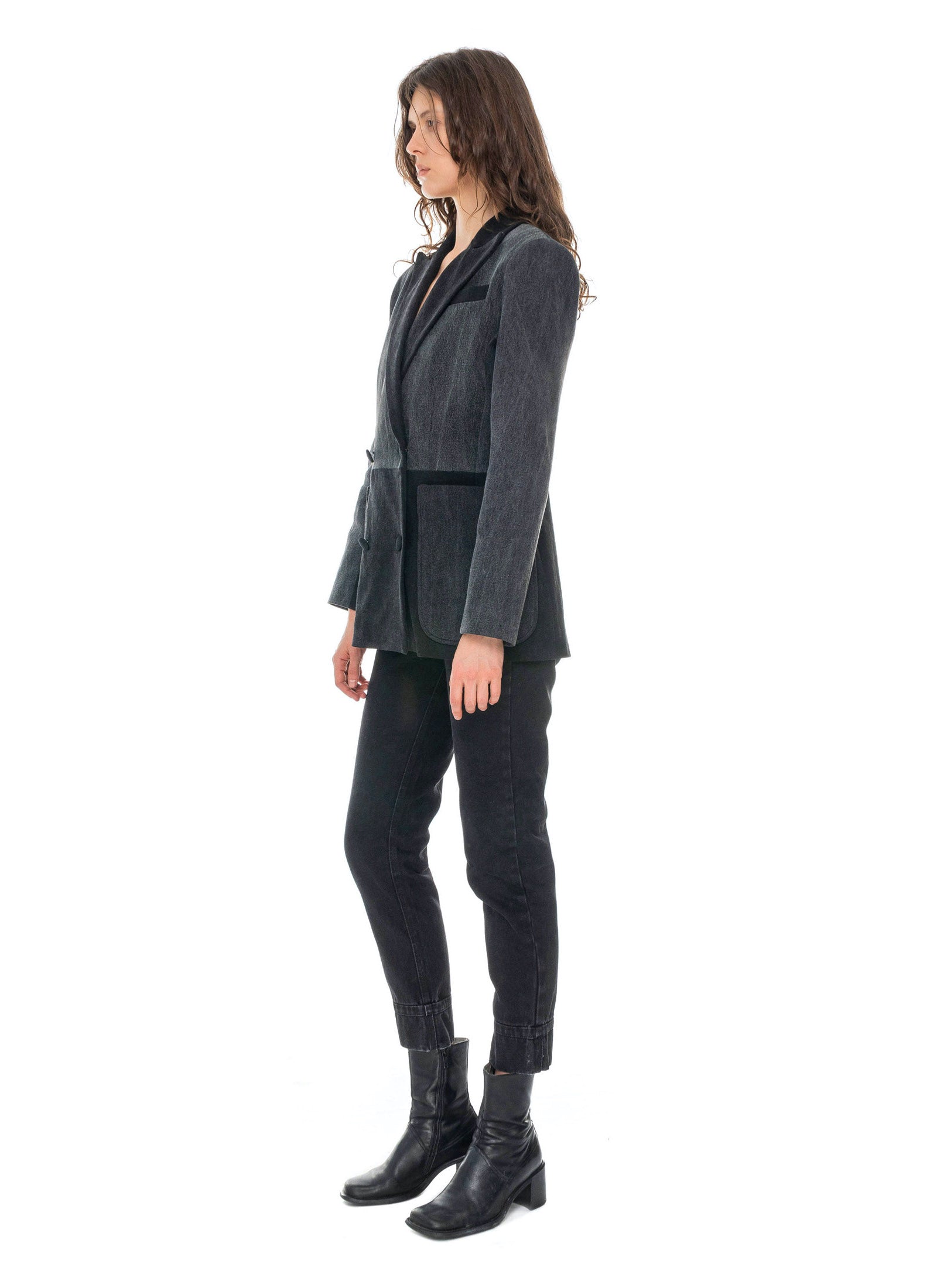 This double-breasted Reworked Black Denim Blazer features large pockets and relaxed fitting. The blazer is upcycled from second-hand denim.