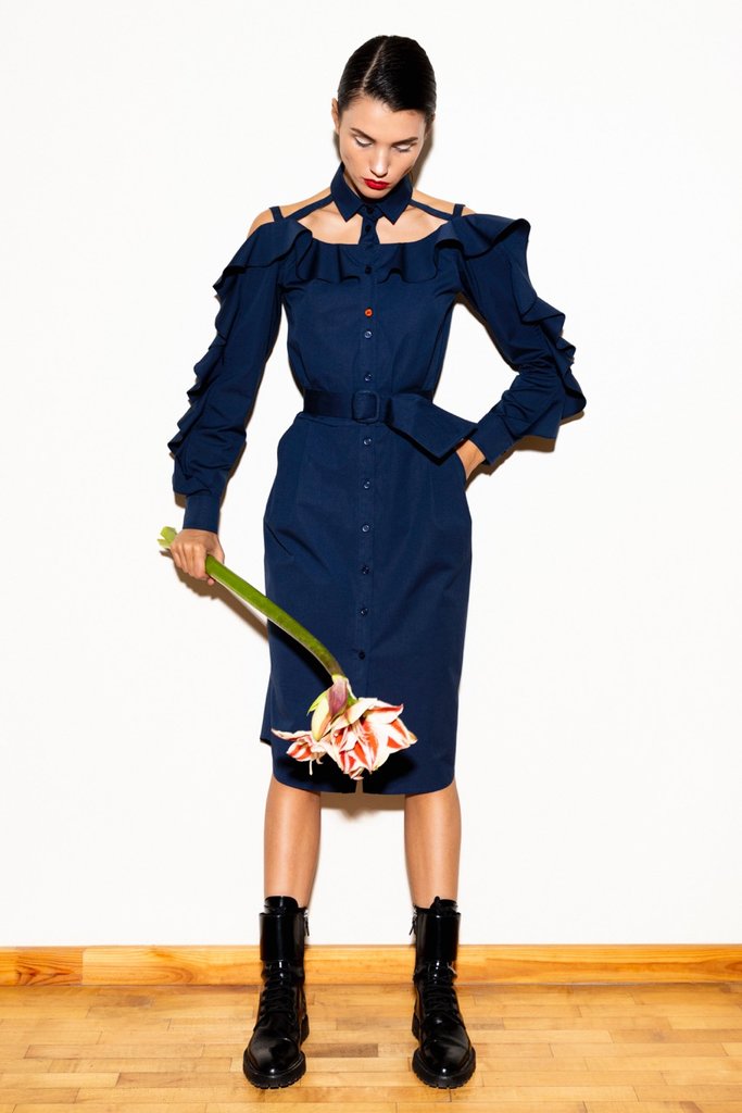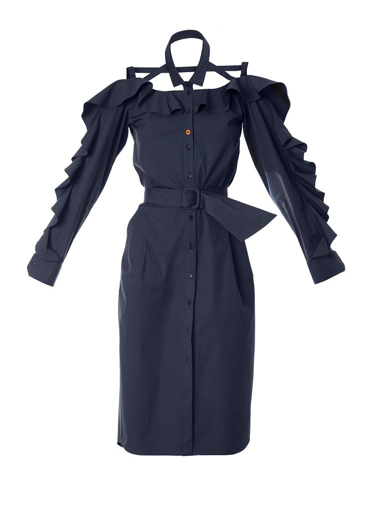 A stretch cotton long sleeve shirtdress with ruffle detail, side pockets and belt.
