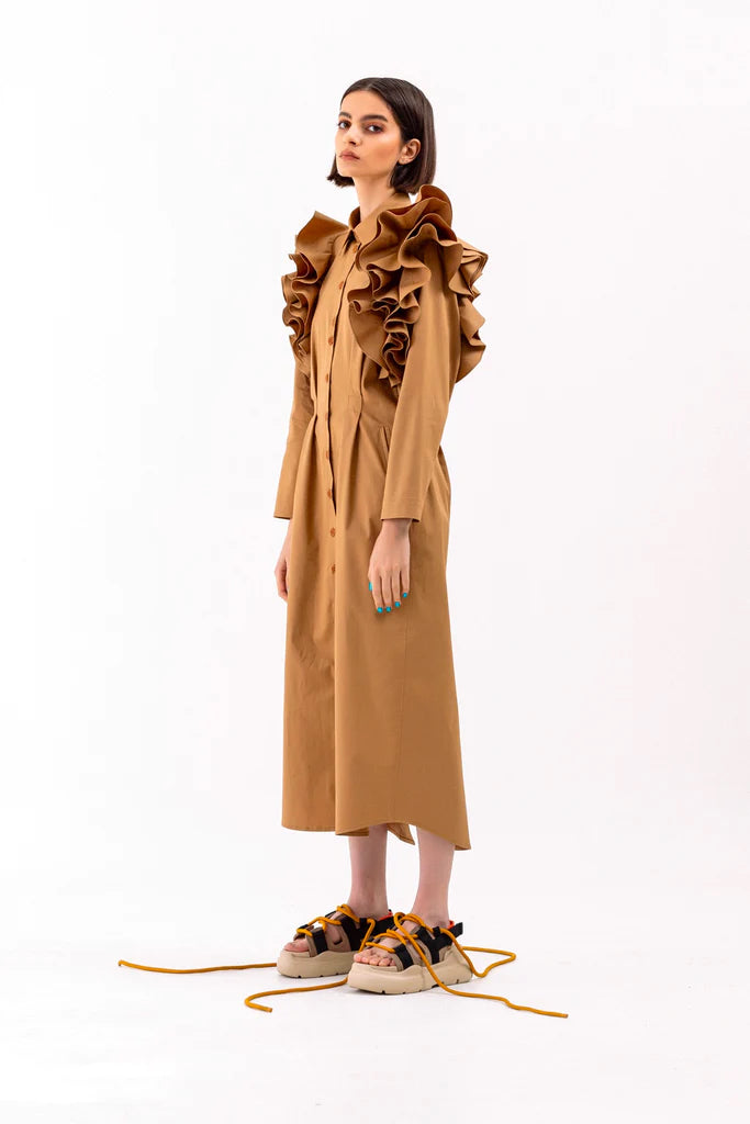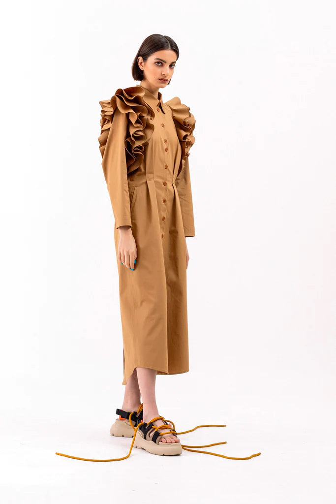 SOMEFANCYNAME.COM brings you this sustainably made Ruffled Shoulders Dress - French Beige. This midi-length dress features half-raglan sleeves, side pockets, and a buttoned front for a comfortable fit. Ruffles accent the shoulders, while a slit along the back highlights the slender waistline.
