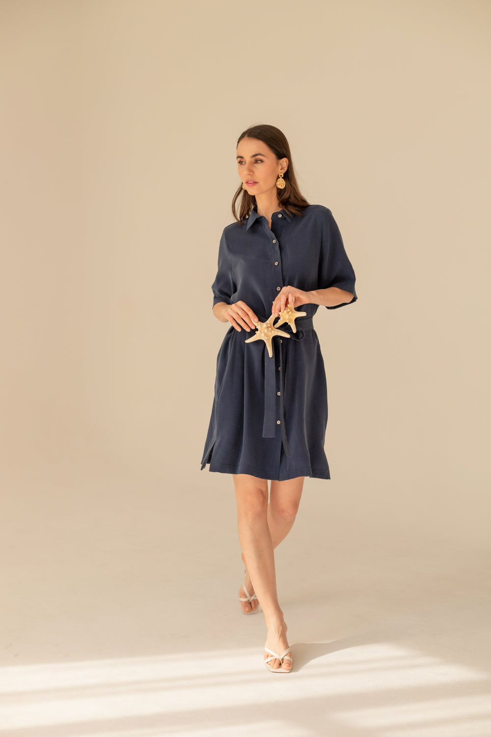 SOMEFANCYNAME.COM brings you a locally-crafted Soleil Cupro Dress - Navy Blue. It is ideal for warm days and holiday getaways. It features a loose shirt cut, short sleeves, pearl buttons, and a tie belt. Small side slits add a breezy feel to the silhouette.