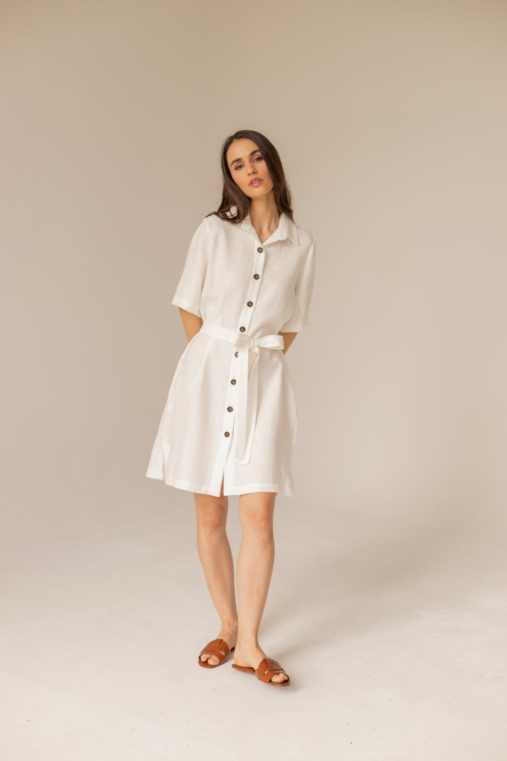 SOMEFANCYNAME.COM brings you a locally-crafted Soleil Linen Dress - Ecru. It is ideal for warm days and holiday getaways. It features a loose shirt cut, short sleeves, brown buttons with the brand emblem, plus a coordinating tie belt. Small side slits add a breezy feel to the profile.