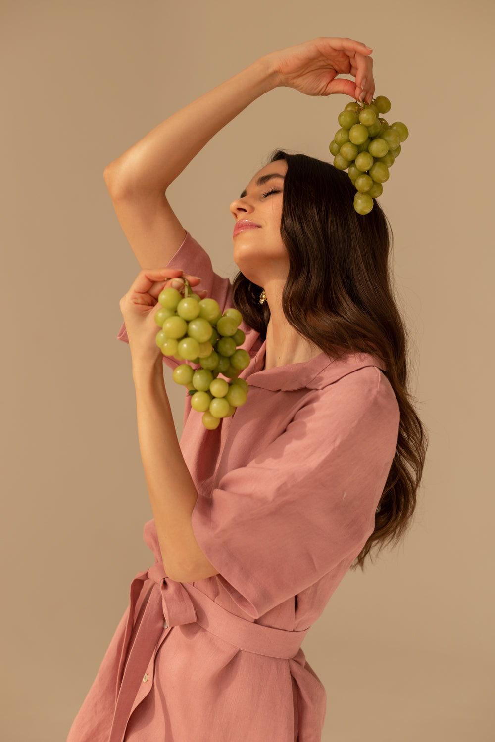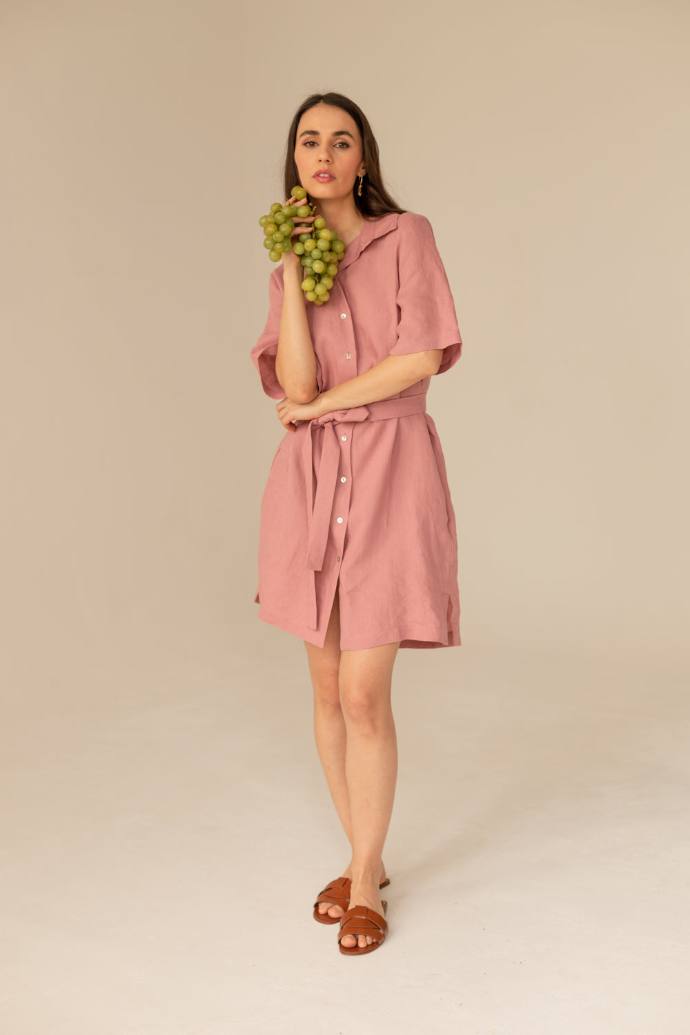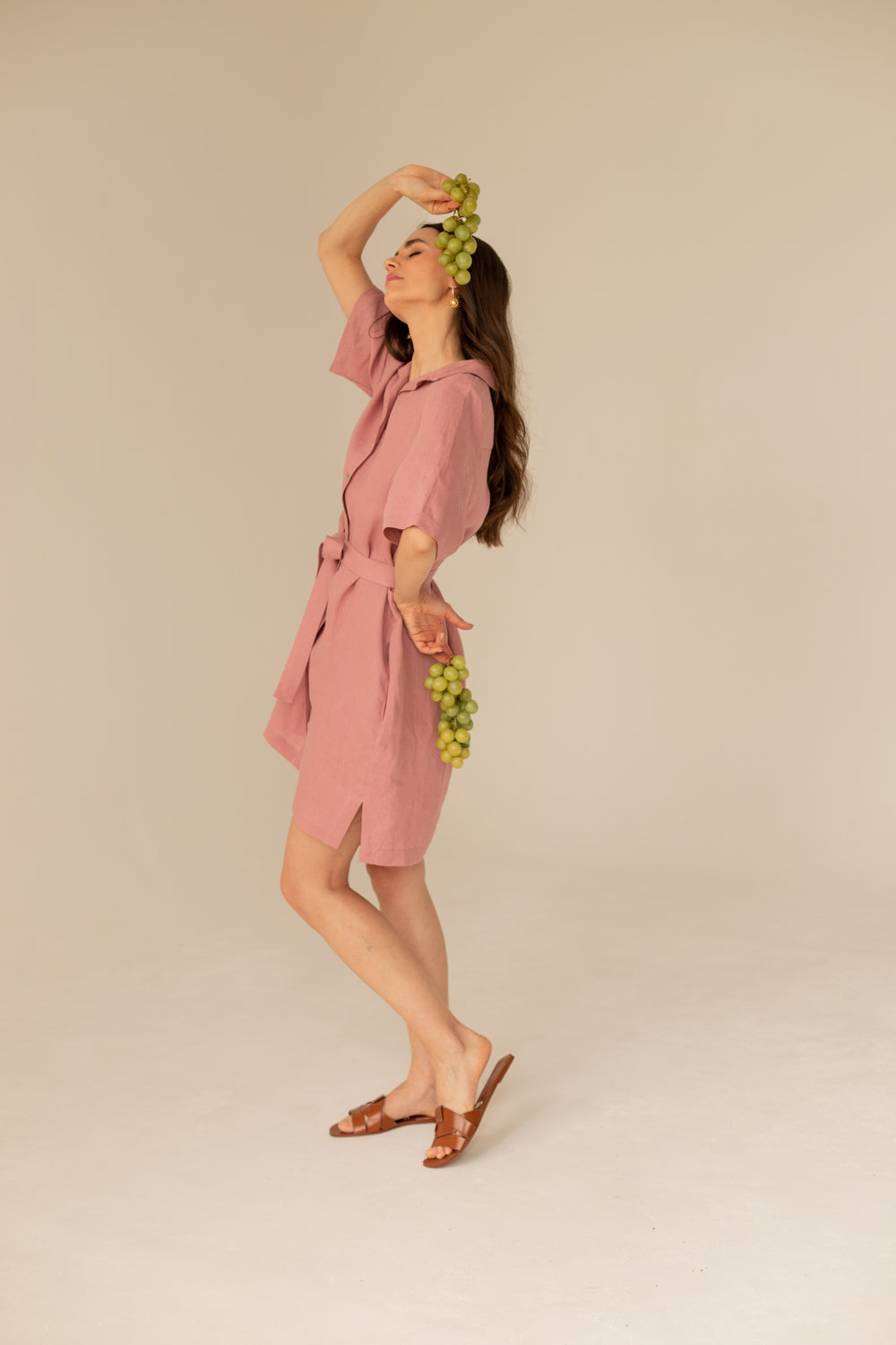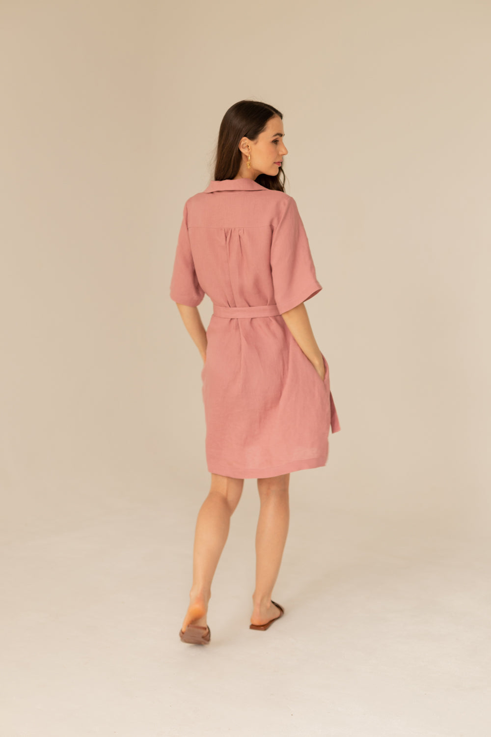 SOMEFANCYNAME.COM brings you a locally crafted Soleil Linen Dress - Pink. It is ideal for warm days and holiday getaways. It features a loose shirt cut, short sleeves, brown buttons with the brand emblem, plus a coordinating tie belt. Small side slits add a breezy feel to the profile.