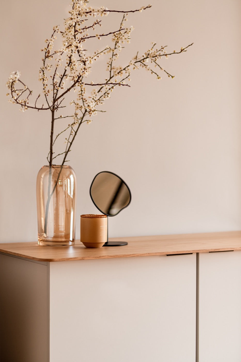 Wood is a natural material, all veins and small knots are a part of wood's nature. Never place any hot objects, such as tealights, or pots directly on the wooden surface, as this may leave permanent marks. All wooden/veneer elements must only be cleaned using lukewarm water and a mild detergent, like soap, and then wiped dry.