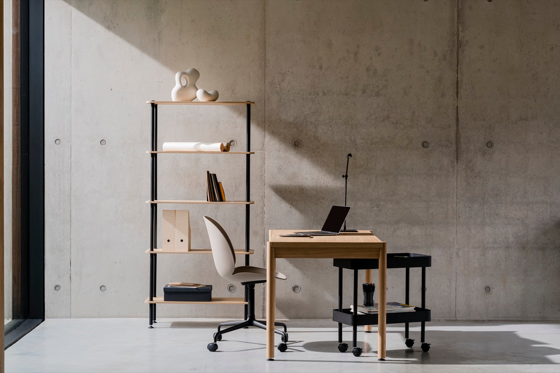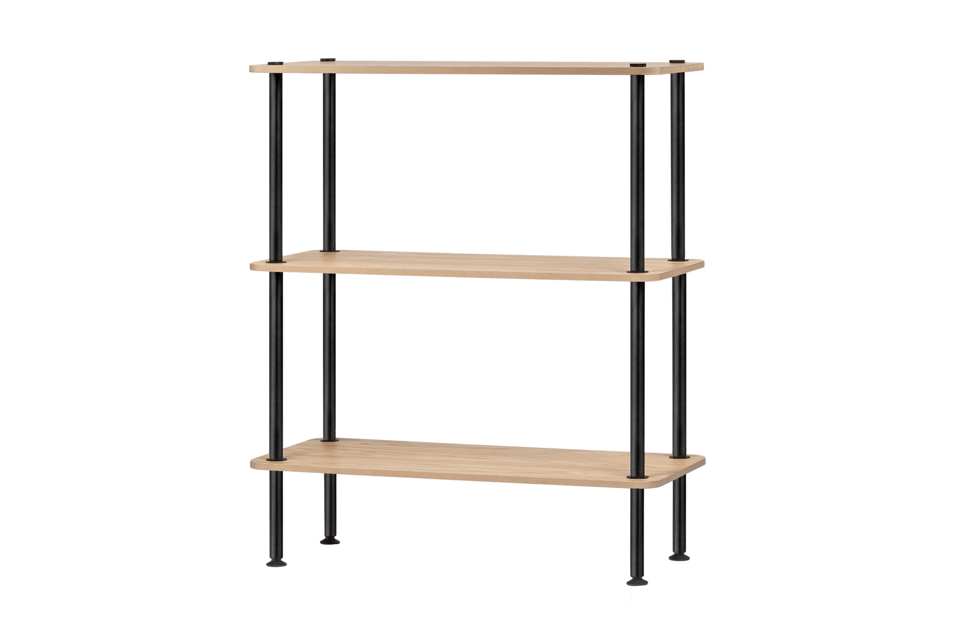 Shelves: oak veneer/MDF board. Frame: water-based transparent matt lacquer