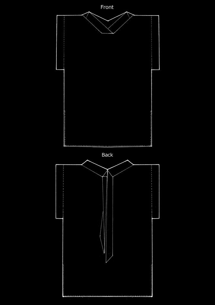 An over-silhouette caftan in 100% Italian virgin wool. It has a rich natural shiny light texture and is wearable in all seasons as a dress and cape. It is featured with Kimono sleeves, folded square collar, removable back neck long ribbon and side slits.