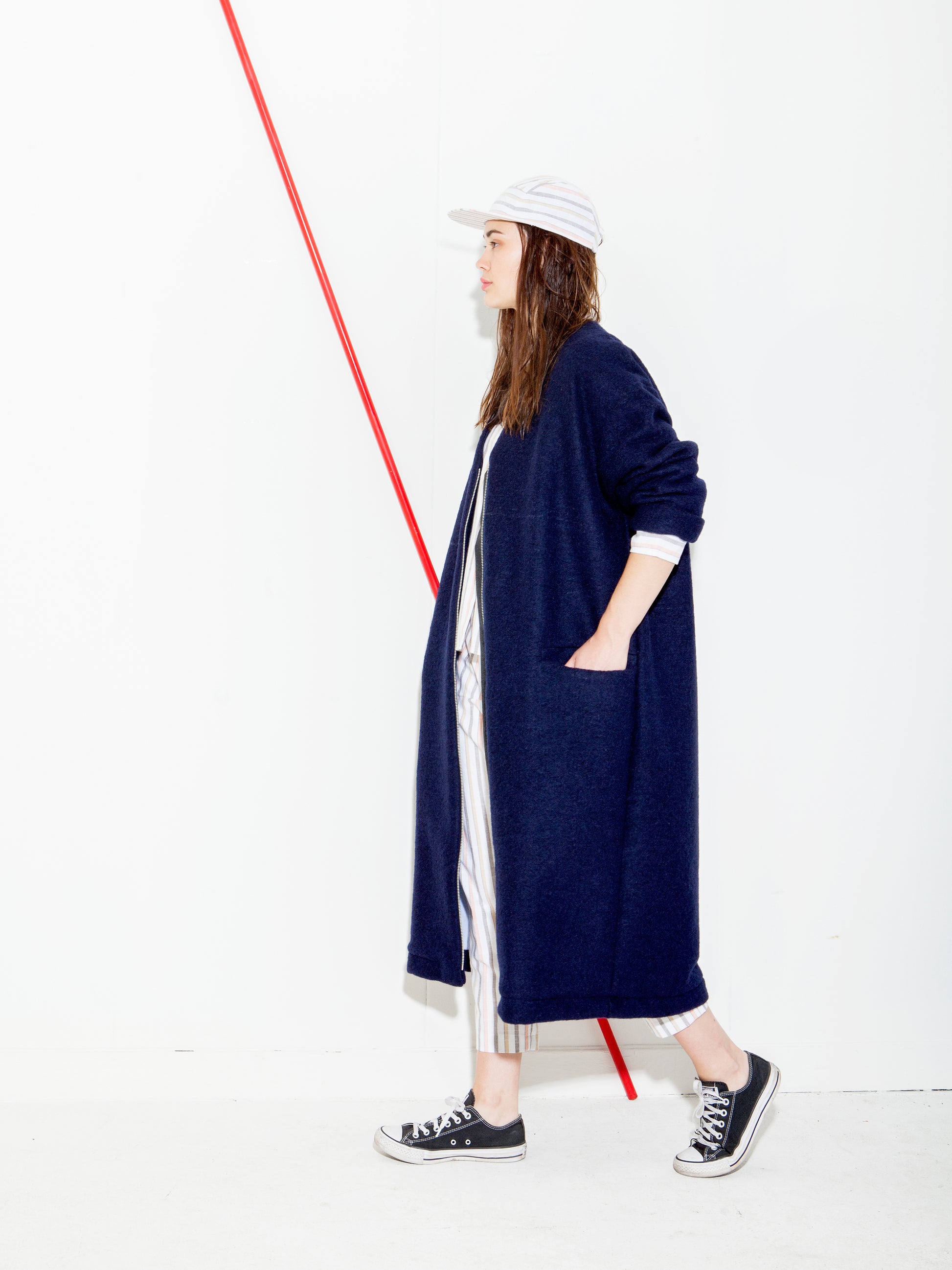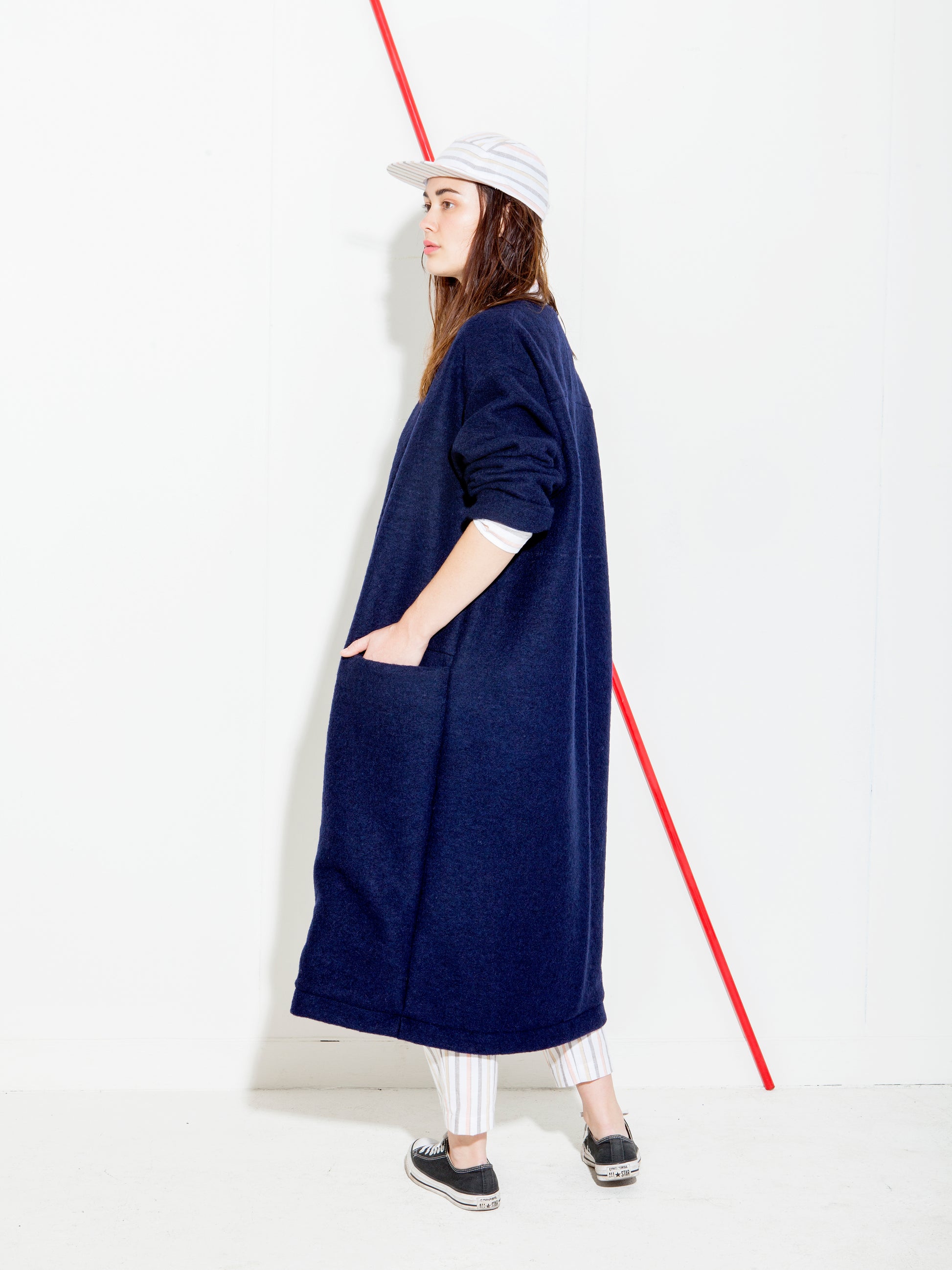 Oversized coat with raglan sleeves. This long woolen coat is perfect for in-between seasons. It features pockets in front, two way zipper and a light blue viscose lining.