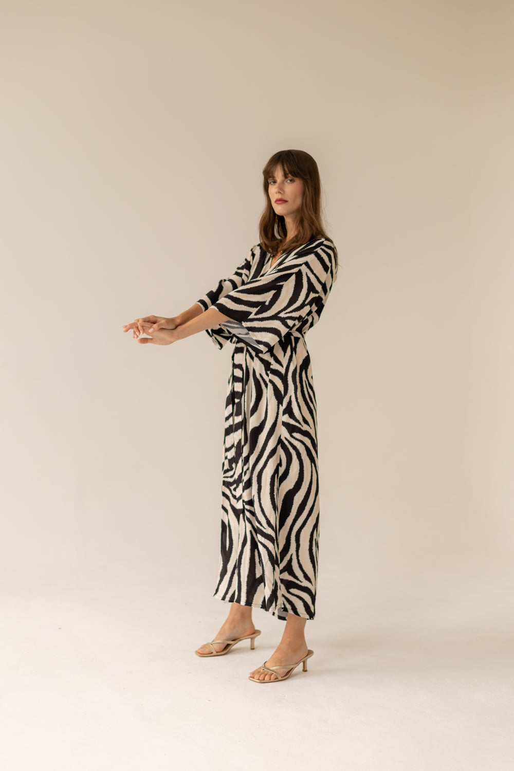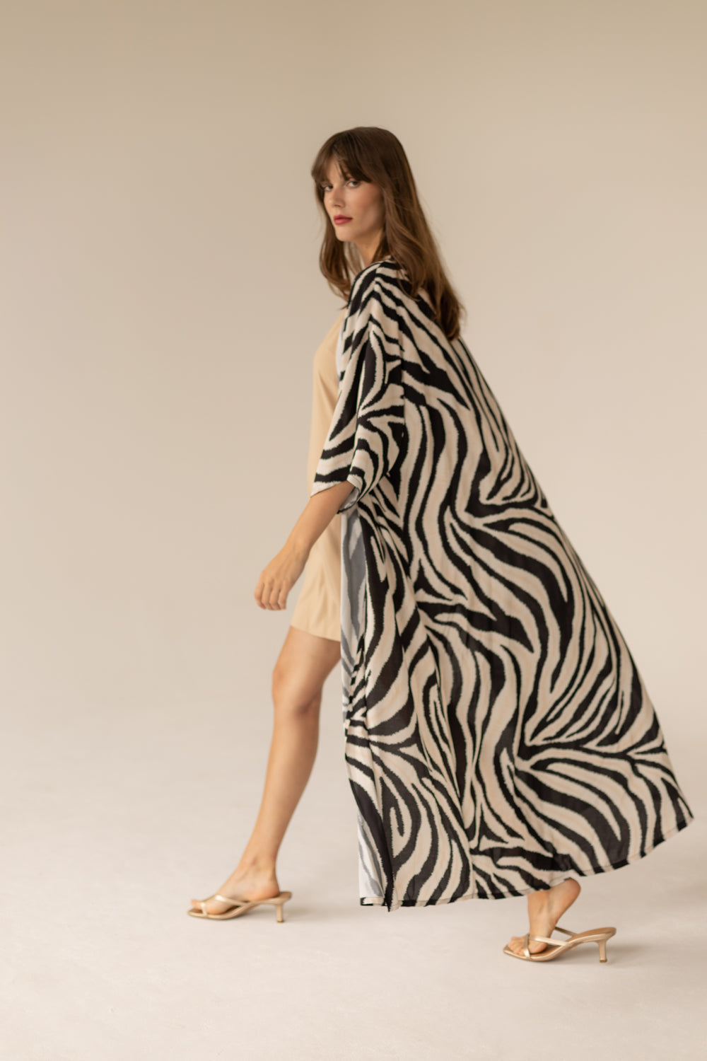 SOMEFANCYNAME.COM is proud to present the Zebra Maxi Pareo Dress in Print. This kimono-cut maxi dress is a versatile piece that can be worn for trips to warm weather destinations or styled for parties. The "from beach to bar" concept was kept in mind while designing this dress, making it perfect for wearing to the beach during the day over a swimsuit or short slip dress, and styled with jewelry for a party in the evening.