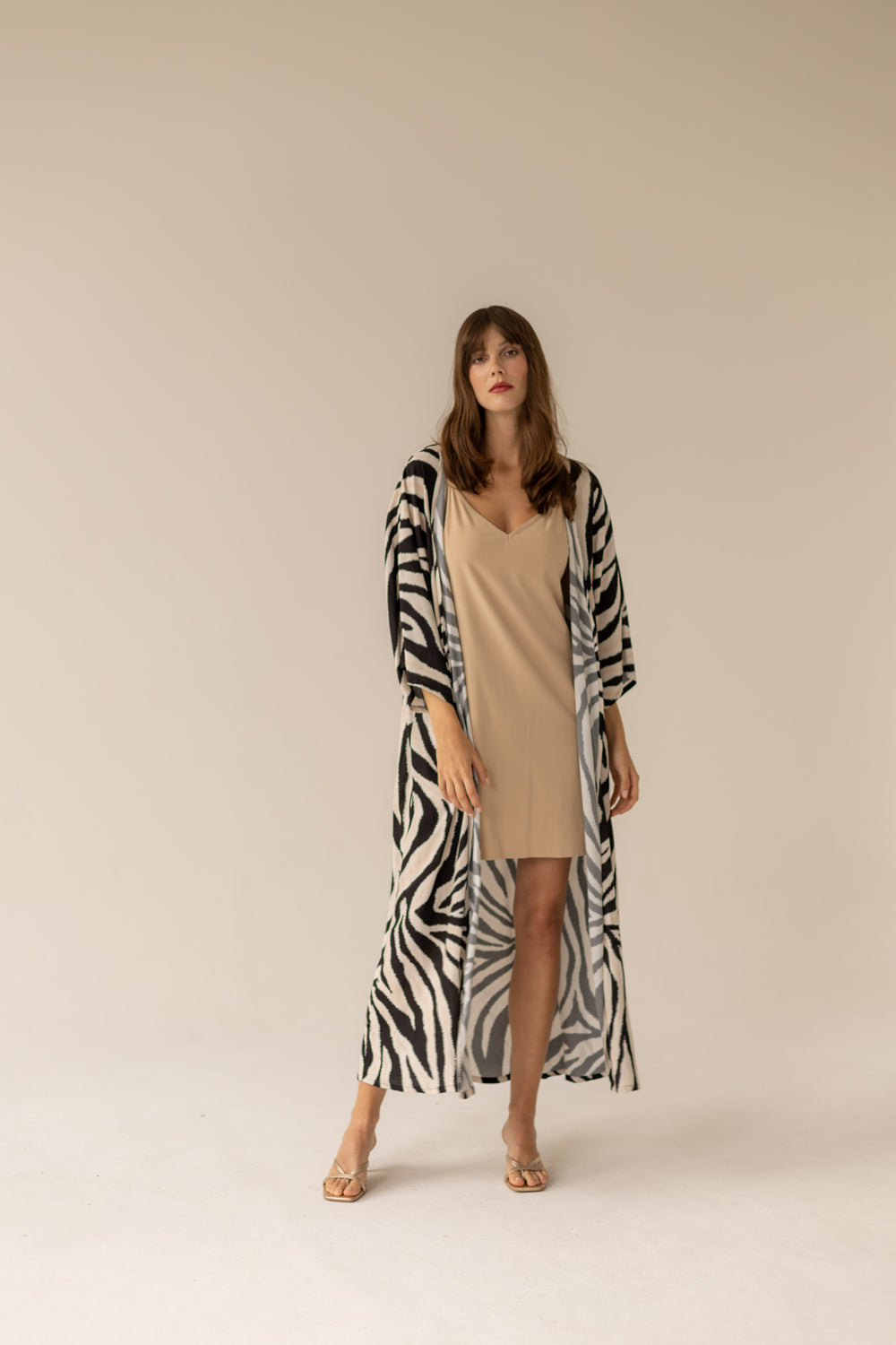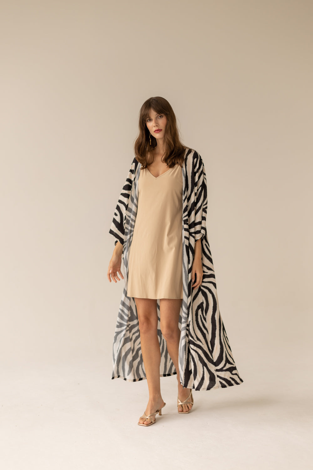 The Pareo dress is available in two color versions: classic zebra and caramel. Our own pattern was used to create the print on the fabric. The classic version is creamy black, while the second version is creamy caramel.